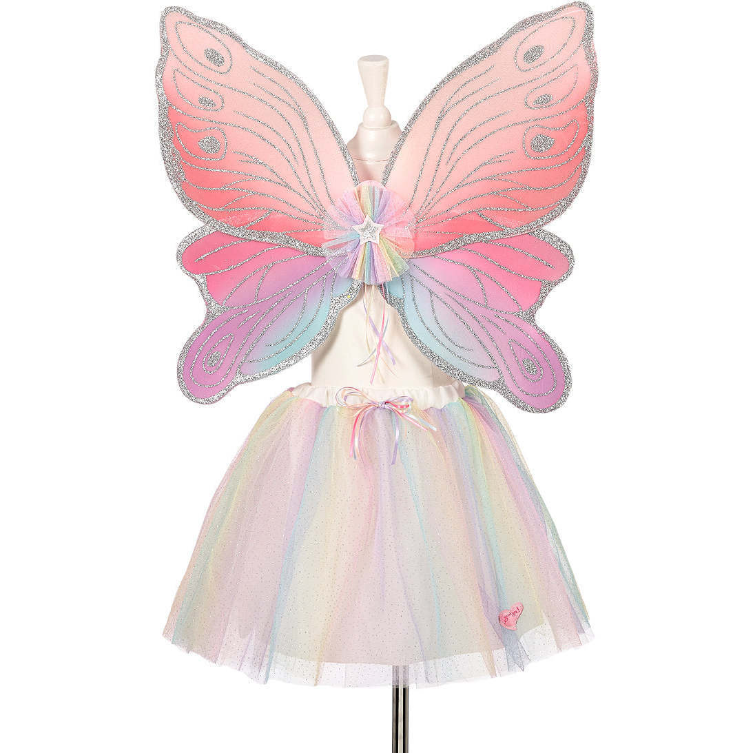 This adorable Souza costume, which represents a fairy in all the colors of the colors and fine glitter details. The costume consists of the following: A set of fairy wings A tulle skirt The Souza wings are in the colors of the rainbow with nice silver glitter. In the middle of the wings there is tulle and a star with silver glitter. The wings have elastic, soft straps, which the kid must wear around the shoulders. The tulle skirt has a good elastic edge edge at the waist, which ensures a good fit. There is a decorative bow on the front. The skirt consists of three layers, of which the two outermost layers both consist of a layer of tulle with rainbow colors and fine silver dots. The inner layer consists of lovely satin, so it is nice for the kid to wear.
