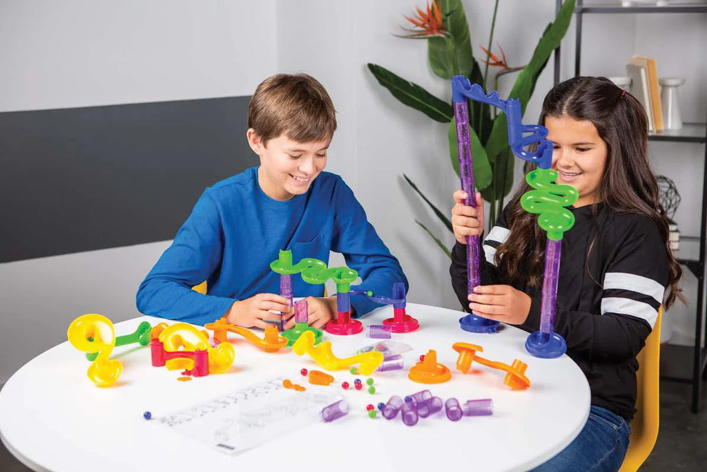 The set includes two start funnels where marbles begin their journey, inspiring kids to experiment with height, speed, and gravity. Each track piece comes in a solid vibrant color—orange, red, blue, green, yellow, or purple—and is made from high-quality, nontoxic plastic built to handle countless builds and fast-paced marble races.