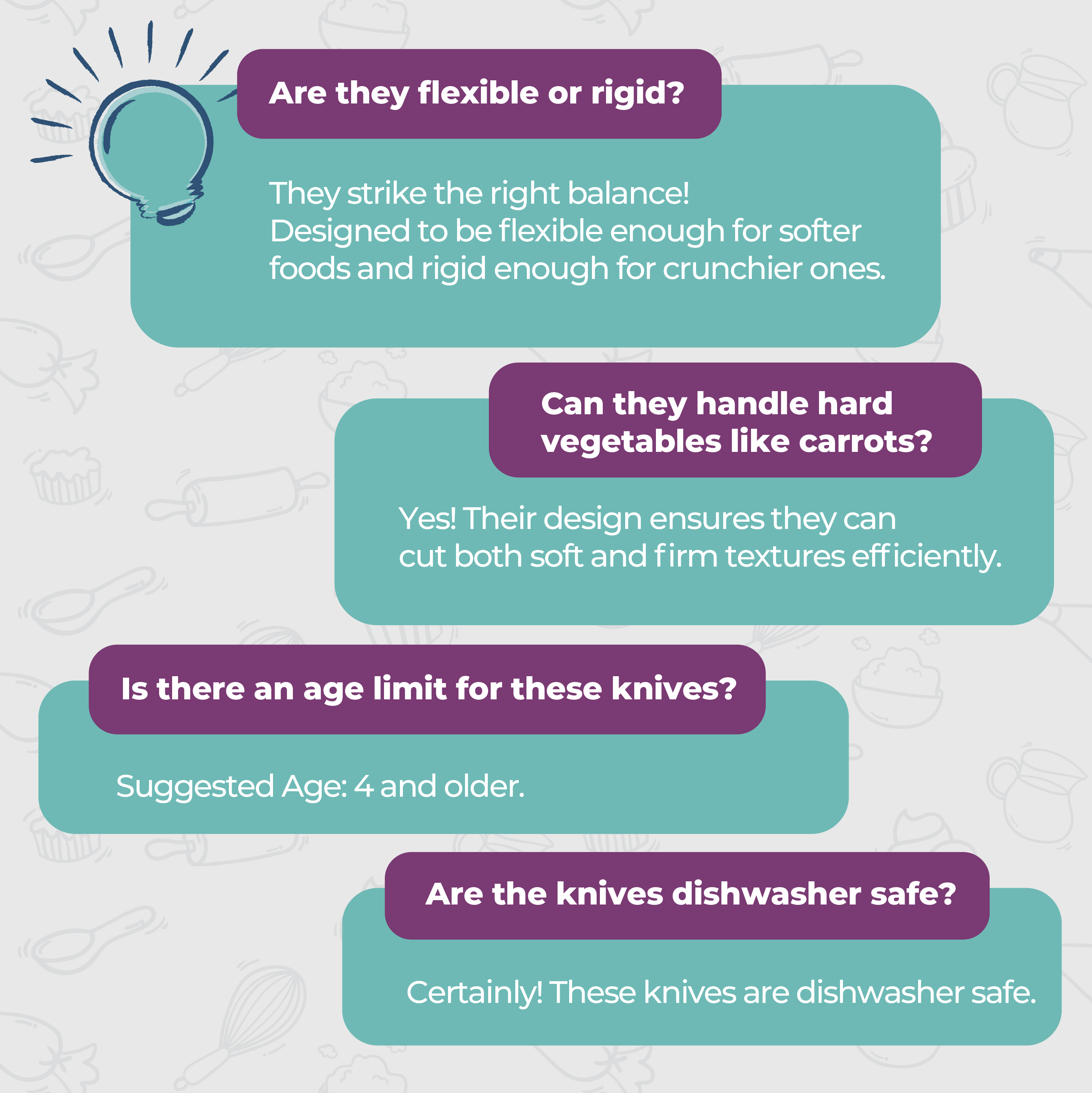 Boost Your Little Chef's Confidence Helping to prepare the food creates a sense of pride in young chefs. The toddler knives are specially designed for children and can help get kids involved in the kitchen early, turning them into confident chefs.