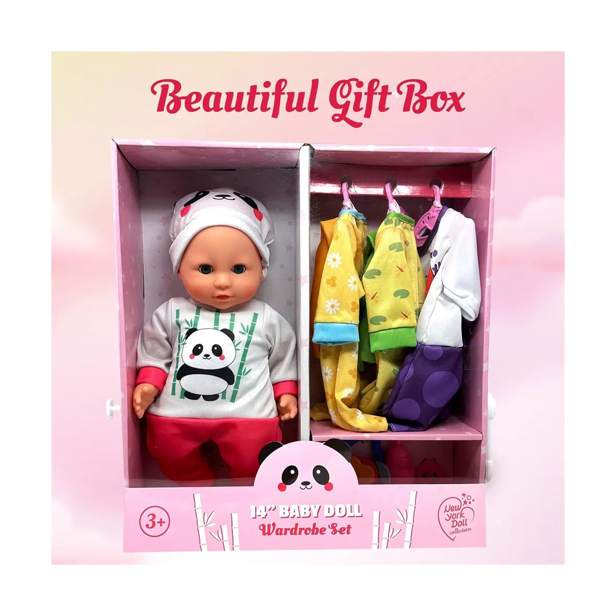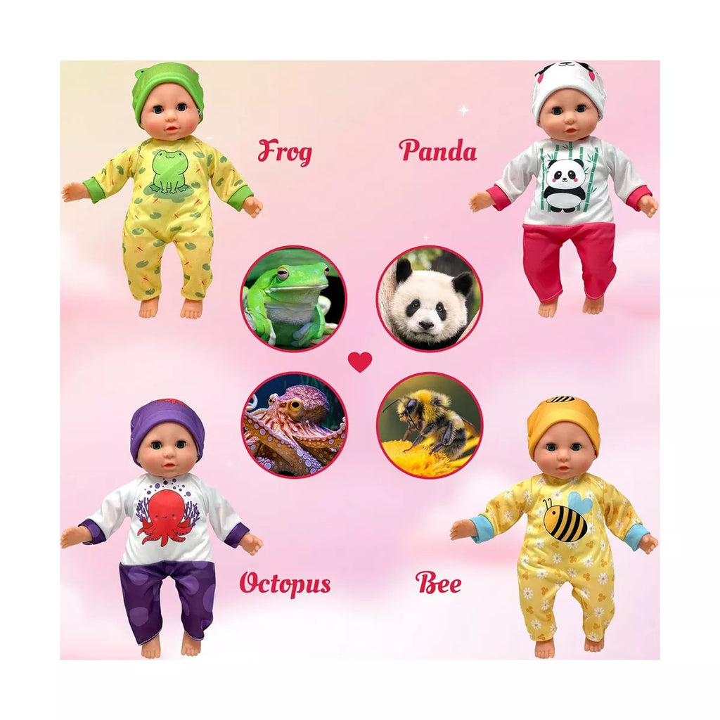Dreamy and delightful, this baby doll and accessories playset features a 14-inch soft body baby doll with clothes and accessories for playing dress up. The clothing kit includes 4 changes of clothes in assorted wild & wacky animals kids love (green frog, purple octopus, red panda, yellow honeybee). Each set includes a matching hat!