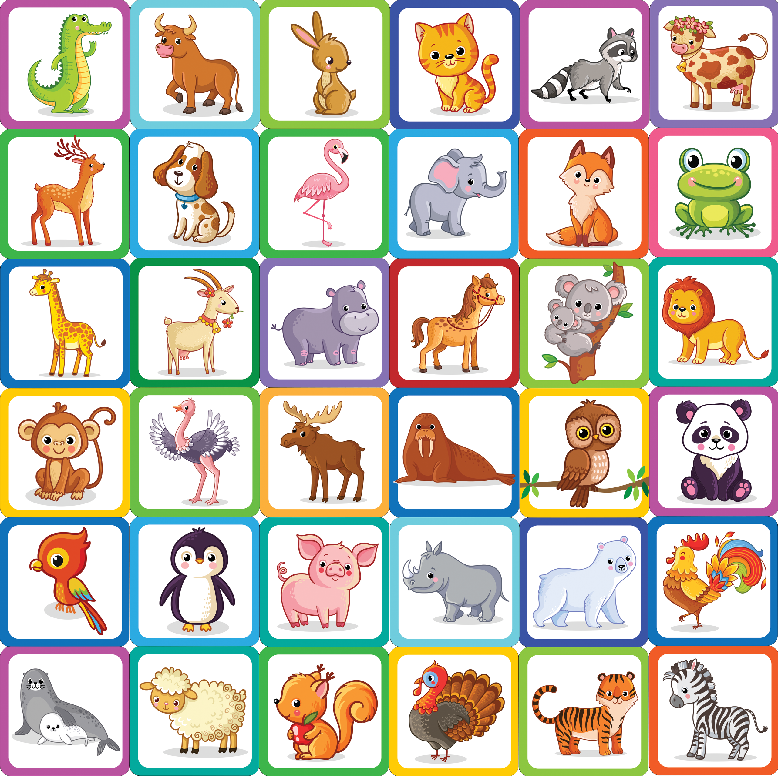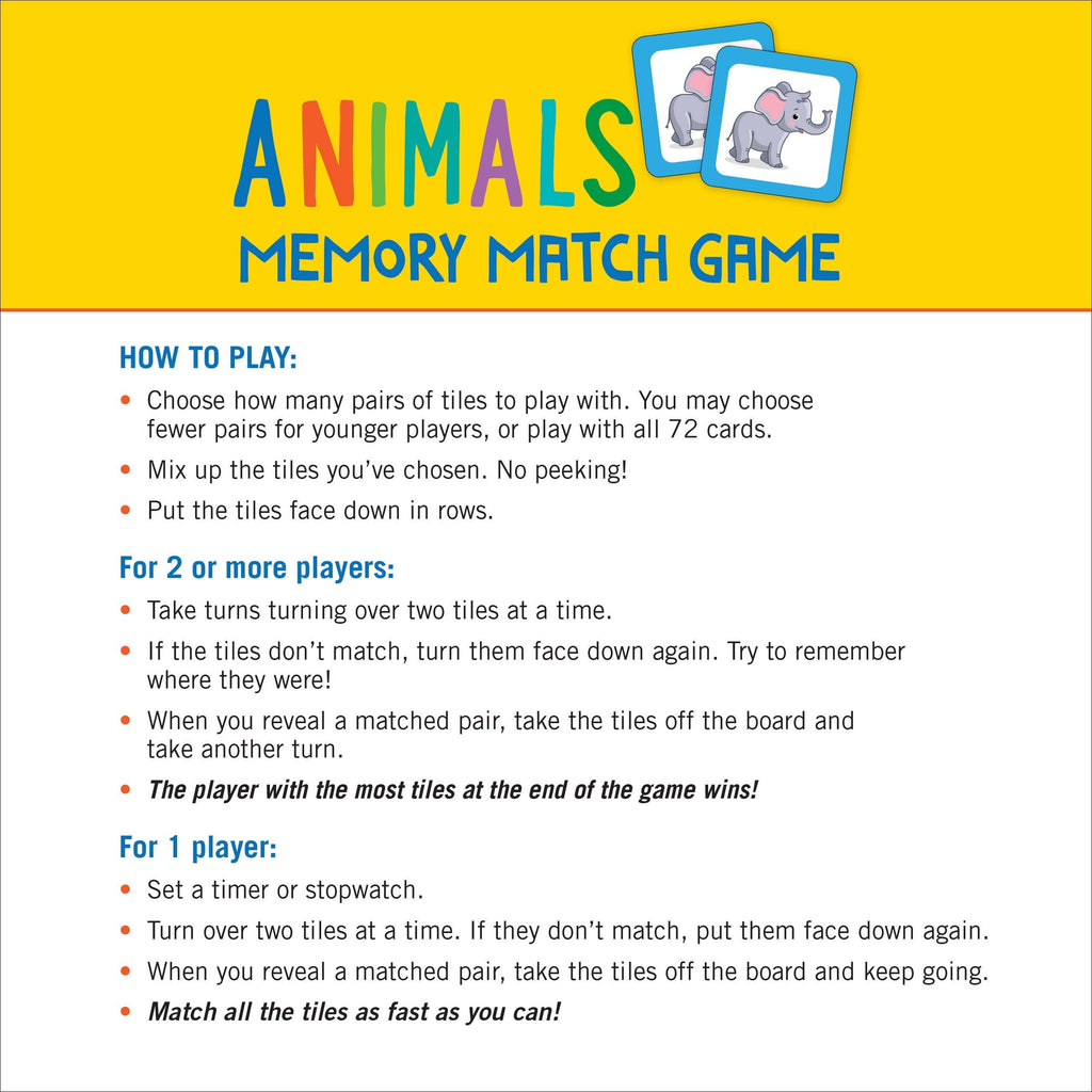 A childhood favorite made new again! Match pairs of animals to sharpen your memory while having fun with this colorful deck of 72 sturdy card tiles. How to play: Choose how many pairs of tiles to play with. Choose fewer pairs for younger players or play with all 72 tiles. Mix up the tiles you've chosen. (No peeking!) Put tiles face down in rows. For 2 or more players: Take turns turning over 2 tiles at a time. If tiles don't match, put them face down again. Try to remember where they were! When you reveal a matched pair, take the tiles off the board, and take another turn. The player with the most tiles at the end of the game wins! For 1 player: Set a timer or stopwatch. Turn over 2 tiles at a time. If they don't match, put them face down again. When you reveal a matched pair, take the tiles off the board, and keep going. Match the tiles as fast as you can!