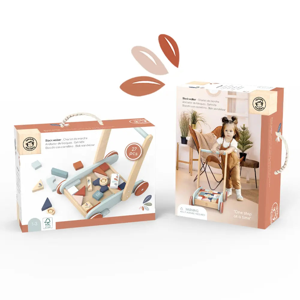 Wonderful toy for baby taking his first steps! Helps your little one to stand and walk, developing stability and essential balancing skills. The 27 colorful blocks included serve as weight for the wagon when baby pushes it but also add fun to stacking and building. This Block walker was designed with a brake system for your toddler's safety. This toy is crafted from sustainably sourced wood from FSC certified forests. Presented in a beautiful gift box.