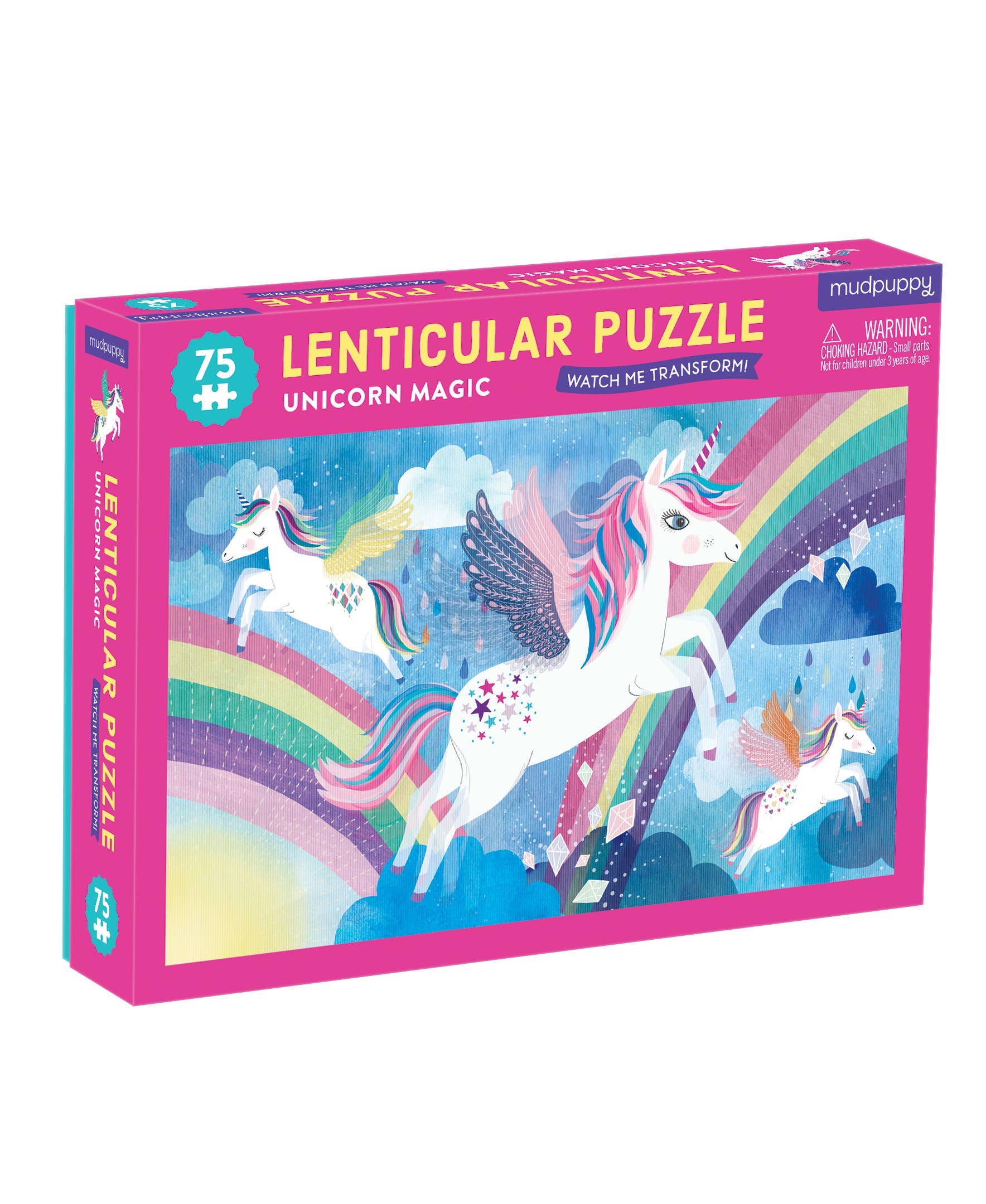 The Unicorn Magic 75 Piece Lenticular Puzzle from Mudpuppy is an exciting and innovative puzzle format that when put together has a wonderful picture that transforms and moves right before your eyes. See magical unicorns soar through the sky! Mudpuppy puzzles are packaged in matte-finish sturdy boxes, perfect for gifting, reuse, and storage.