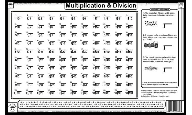 Combining Multiplication and Division into ONE educational placemat allows kids to learn TWO important subjects with less cost to parents. Kids can practice learning using the multiplication and division tables on the front and back sides, and also do everyday problems. Wipe off and practice more.