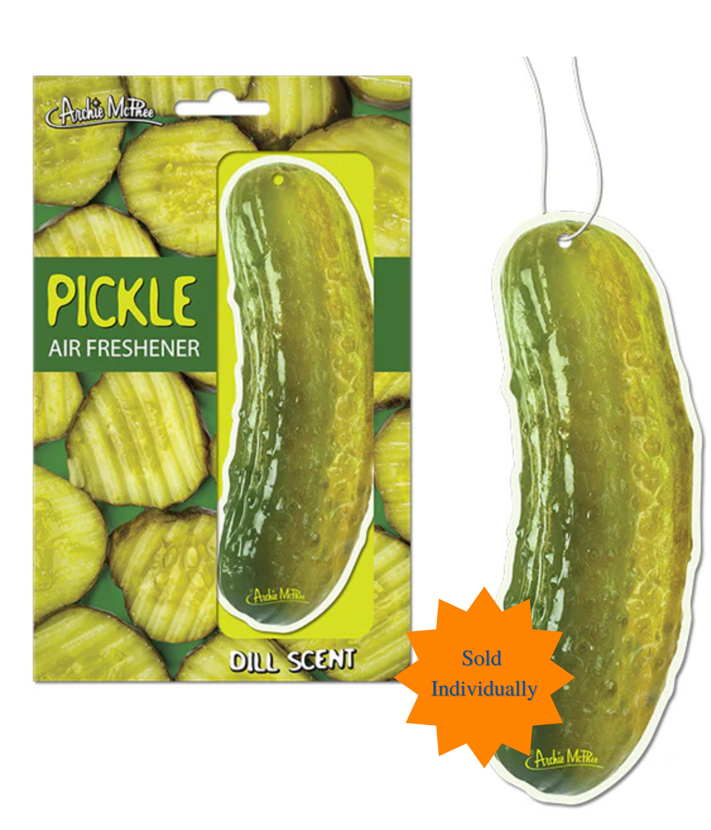 During your commute, do you feel like a pickle in a jar? This Pickle Air Freshener will add some dill to your daily drive as it dangles deliciously from your mirror. This 5-1/2” (14 cm) tall Pickle Air Freshener smells like dill. Made of heavy card stock. String for hanging included. Illustrated cardboard sleeve.