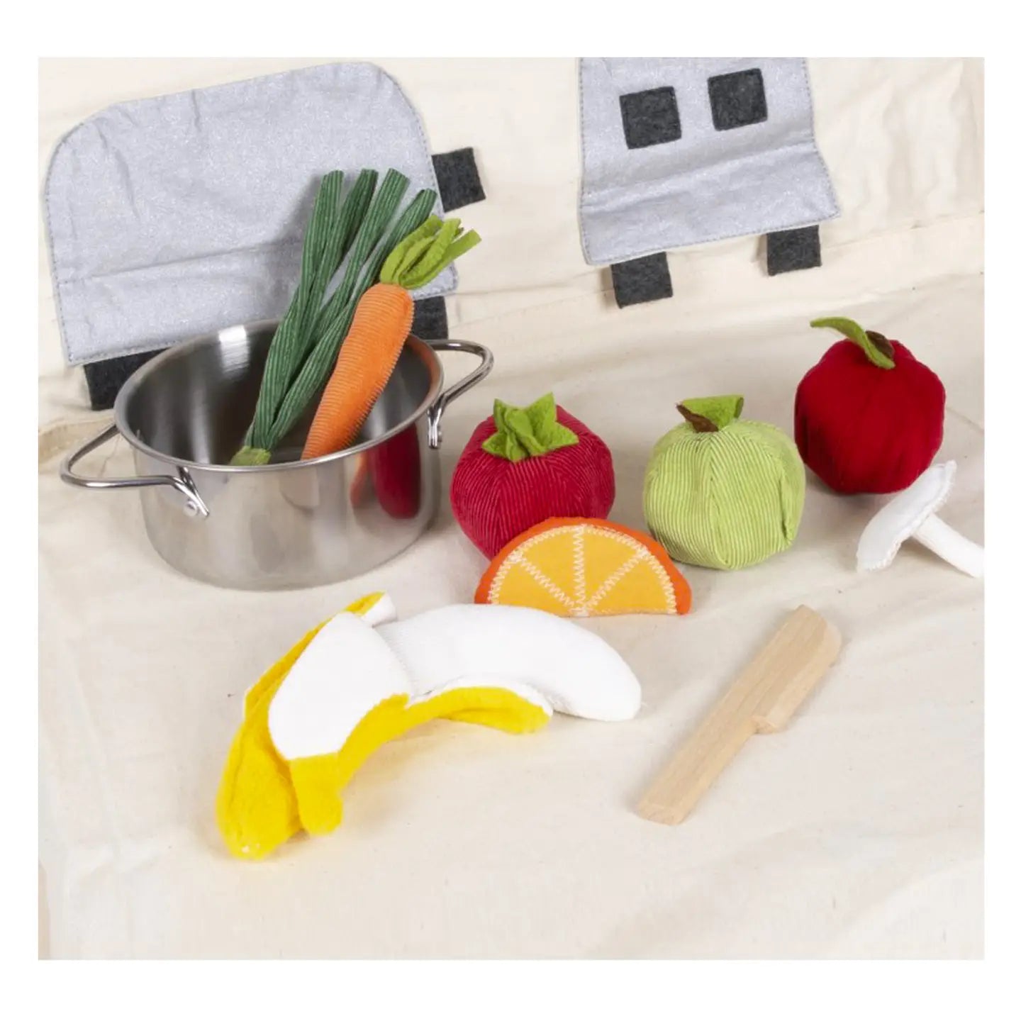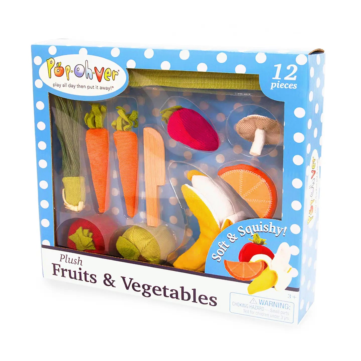PopOhVer Pretend Plush Food Sets are made of all-natural materials and are the perfect additions to your child’s pretend kitchen. The felt on the outside is made from the softest and most durable polyester felt fabric. The inside is filled with sand to give weight and “true feel” to these pieces. With our Fruits & Vegetables Set, with all their favorite apples, oranges and carrots, and a banana that really peels!