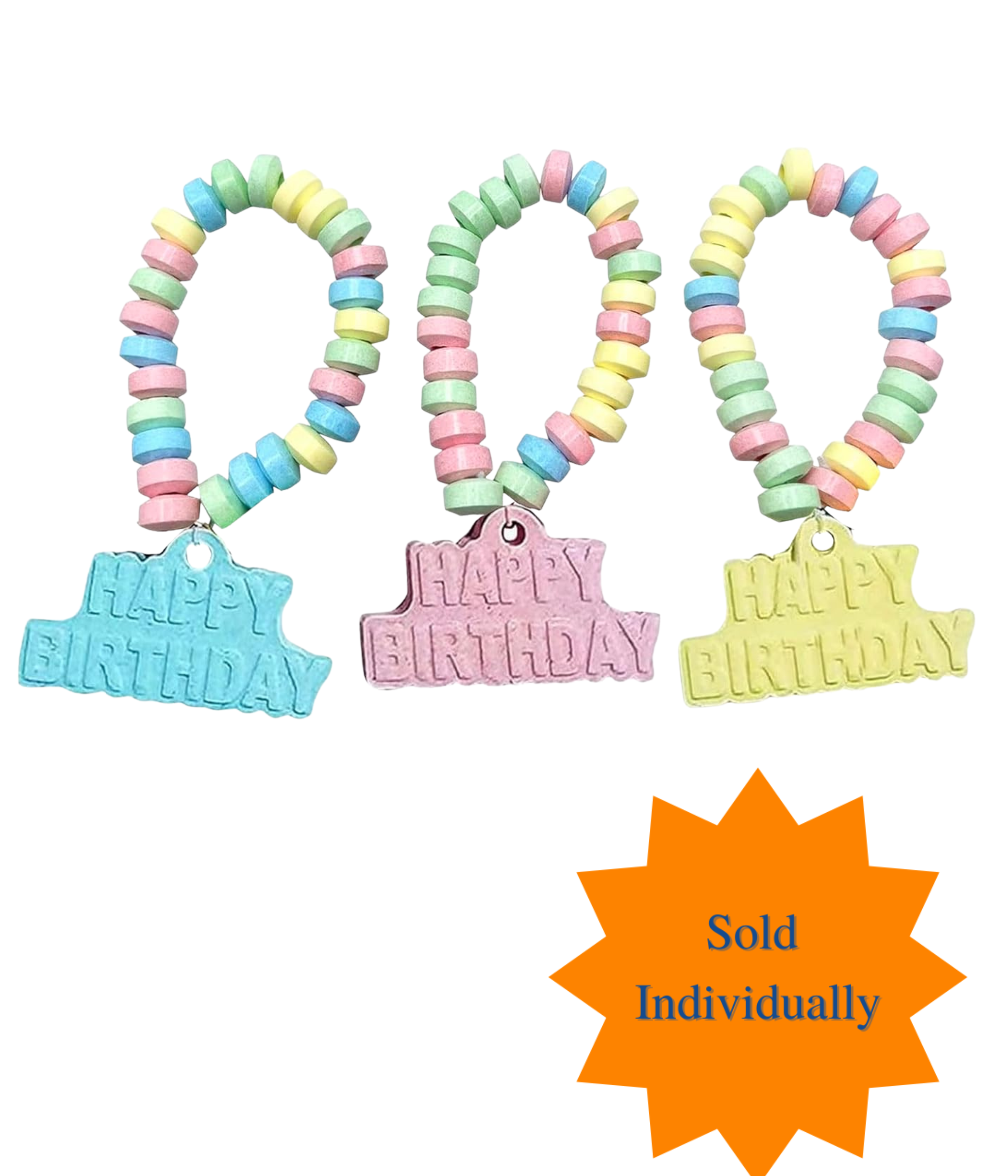 Slip on a burst of sugary fun with these vibrant candy bracelets! Strung on stretchy elastic, they're perfect for little wrists and packed with colorful, edible beads that taste as good as they look. Each bracelet features a special Happy Birthday charm—ideal for celebrations, party favors, or everyday sweetness. Safe for ages 3 and up, these cheerful accessories let kids wear their treats and enjoy them too!