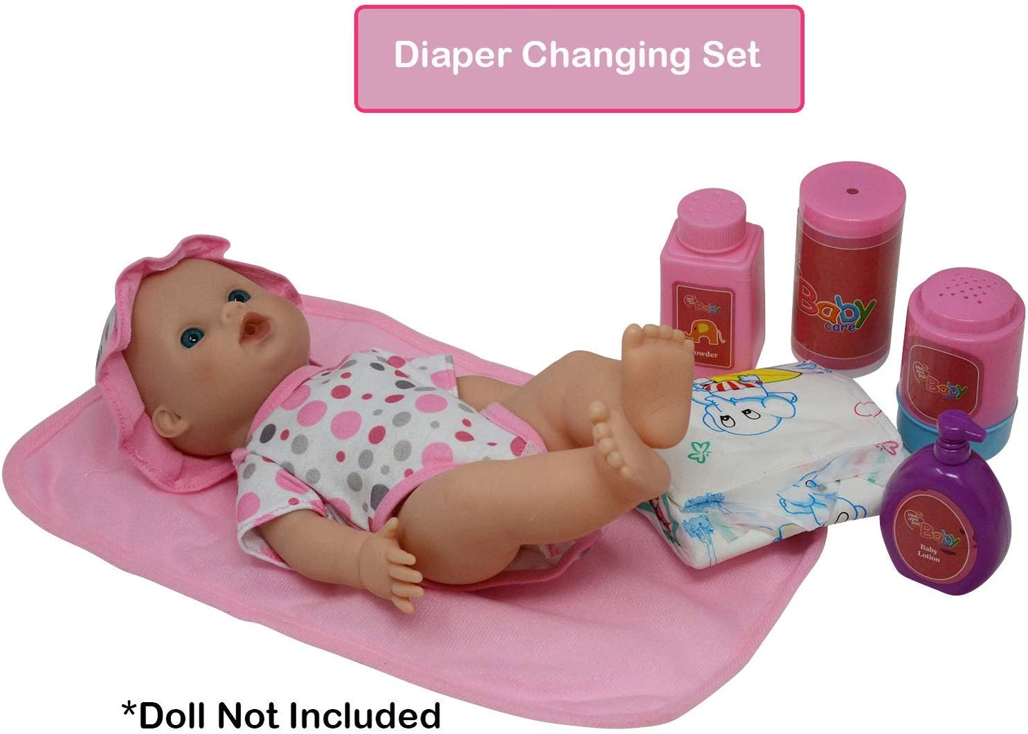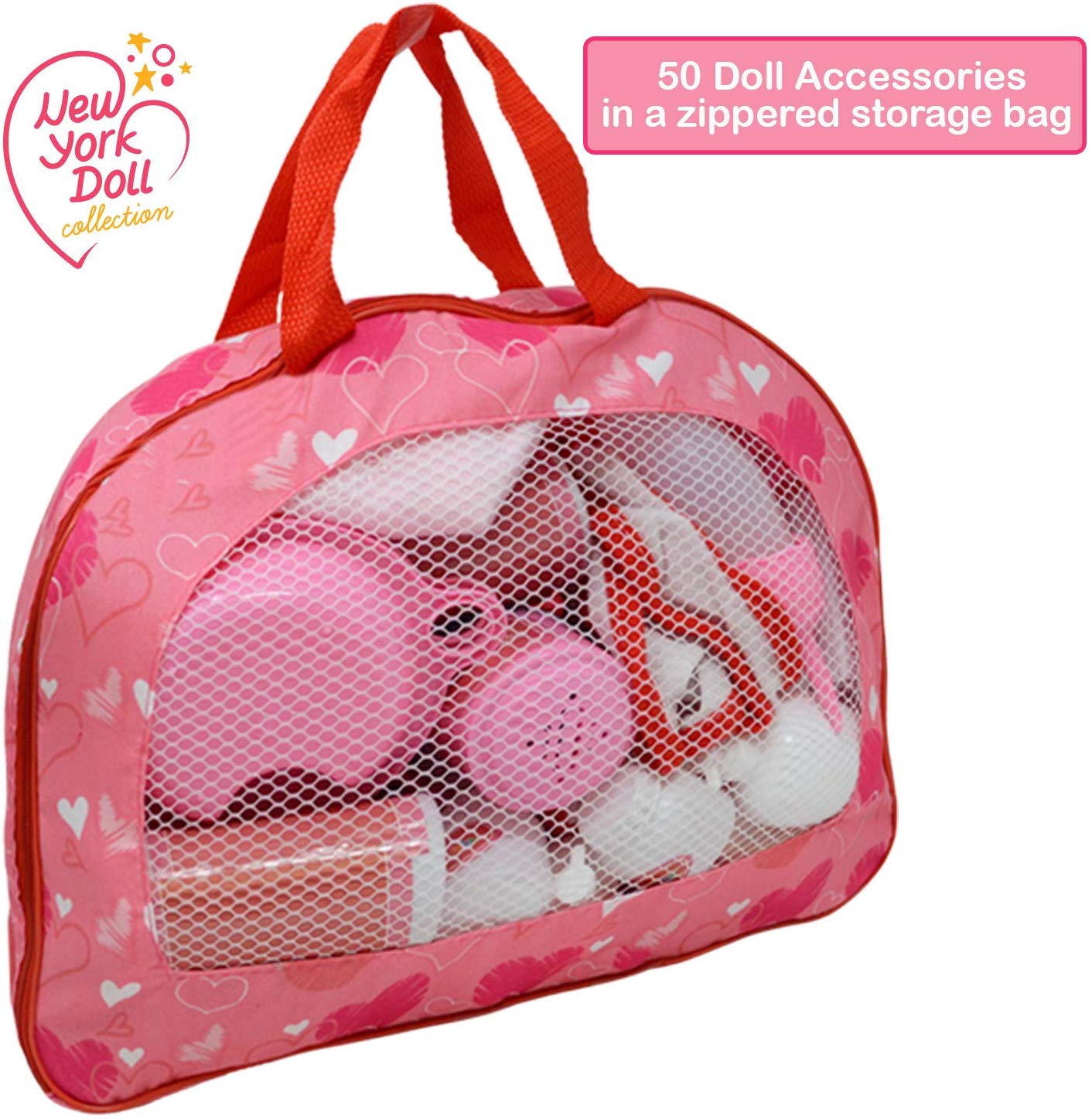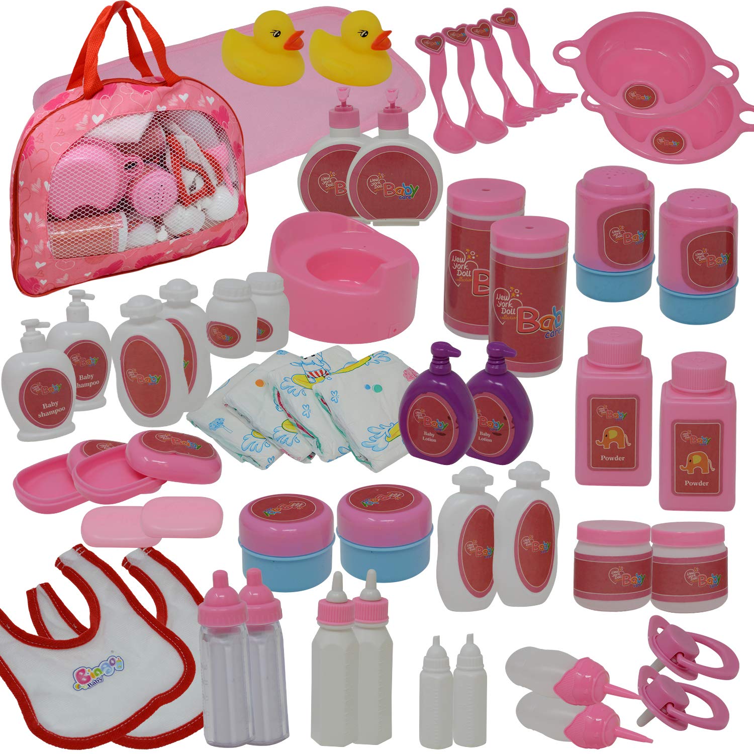 50 baby doll accessories - Stuff to encourage imaginative play in toddlers and girls of all ages Doll feeding set - doll bib, plates, cutlery, milk bottles, pacifier and more baby doll accessories Doll potty time - doll diaper bag with changing mat, pampers and doll potty for toilet training Storage purse- heart designed zippered case that kids will love for pretend play and easy storage Great accessories set.