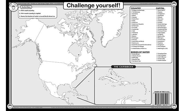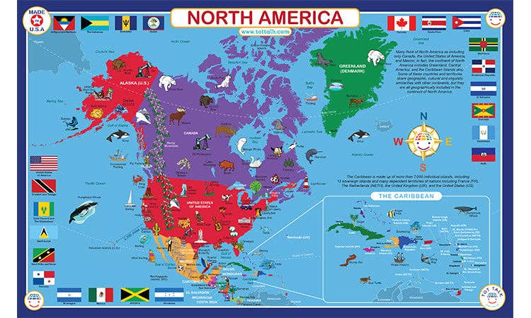 North America is a vast continent that includes not only Canada, the United States and Mexico, but also Greenland, Central America, and the Caribbean Islands. Some of these countries and territories share geographic, cultural and linguistic similarities with other continents, but they are all geographically included in the continent of North America. Explore the entire North American continent and its unique countries, cultural and geographical landmarks, capitals, natural wonders, flags and more. Test yourself on the back side by filling in country, capitals, and bodies of water names in their respective places. Adults and kids will learn! Recommended age: 4 and up Tot Talk Placemats are: • MADE IN USA • Safety-Approved • Award Winning • Anti-bacterial - Wash with dish soap; placemats dry quickly • Used in homes, schools and on the go, traveling or in a restaurant • Lightweight and durable • Dimensions: 17.5" x 11.5"