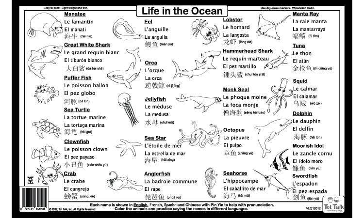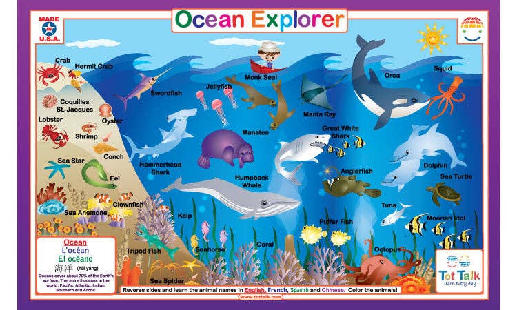 About 71 percent of the Earth's surface is water-covered, and the oceans hold about 96.5 percent of all Earth's water. This biome is almost as mysterious as space. Learn about sea life featuring 30+ ocean dwelling mammals, fish, crustaceans, and plant life. Color and learn animal names in English, Spanish, French, and Chinese on the back side. Pin Yin is included to help with Chinese pronunciation.