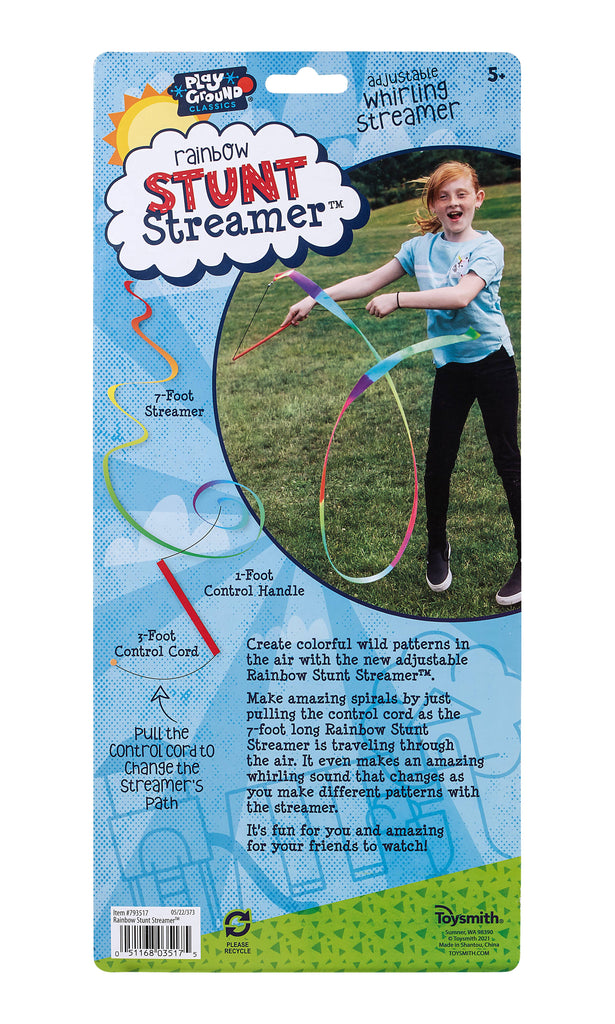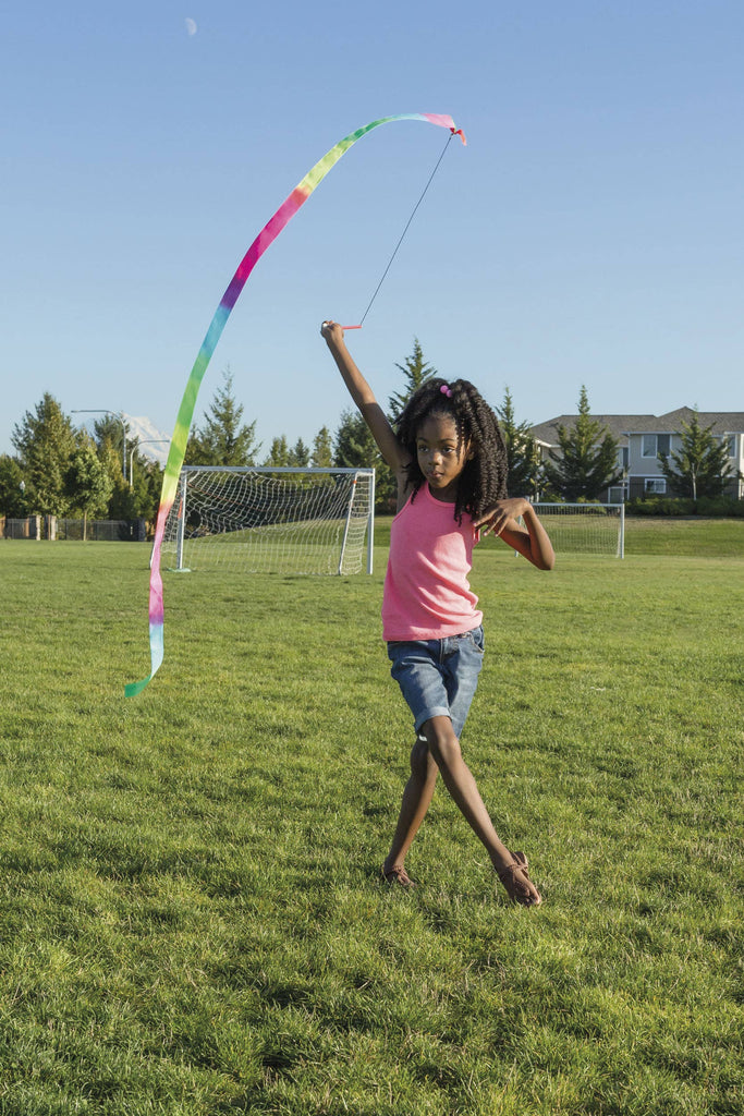 A popular multi-colored neon ribbon baton streamer that creates huge, fluid shapes when it moves. With an easy to hold baton handle, simply pull the control cord to make the ribbon change shape. Designed for outdoor play only. Bright neon-colors create a 6.5-foot streaming rainbow. High-quality plastic material holds up under hours of intense play and resists tears and stains.