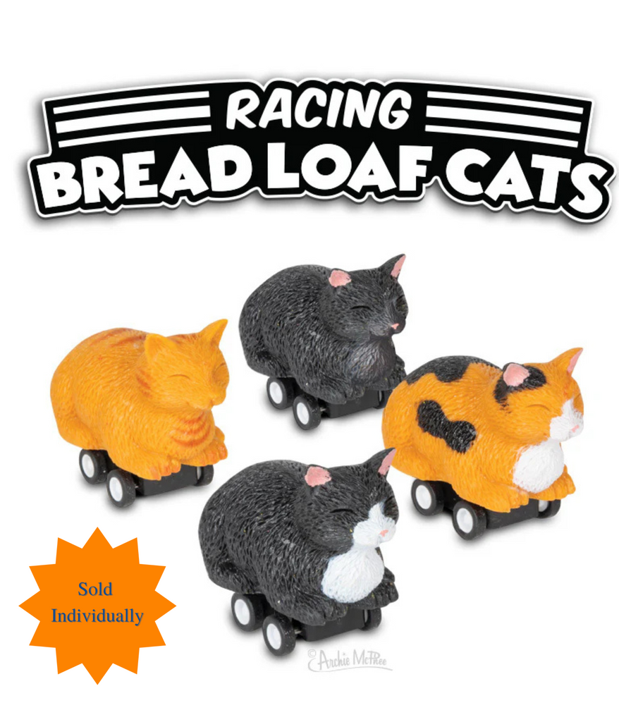 The most relaxed lightning ever! These lightning loaf cat racers capture cats all tucked up in the familiar “loaf of bread” position, but when you pull them back, they shoot forward!