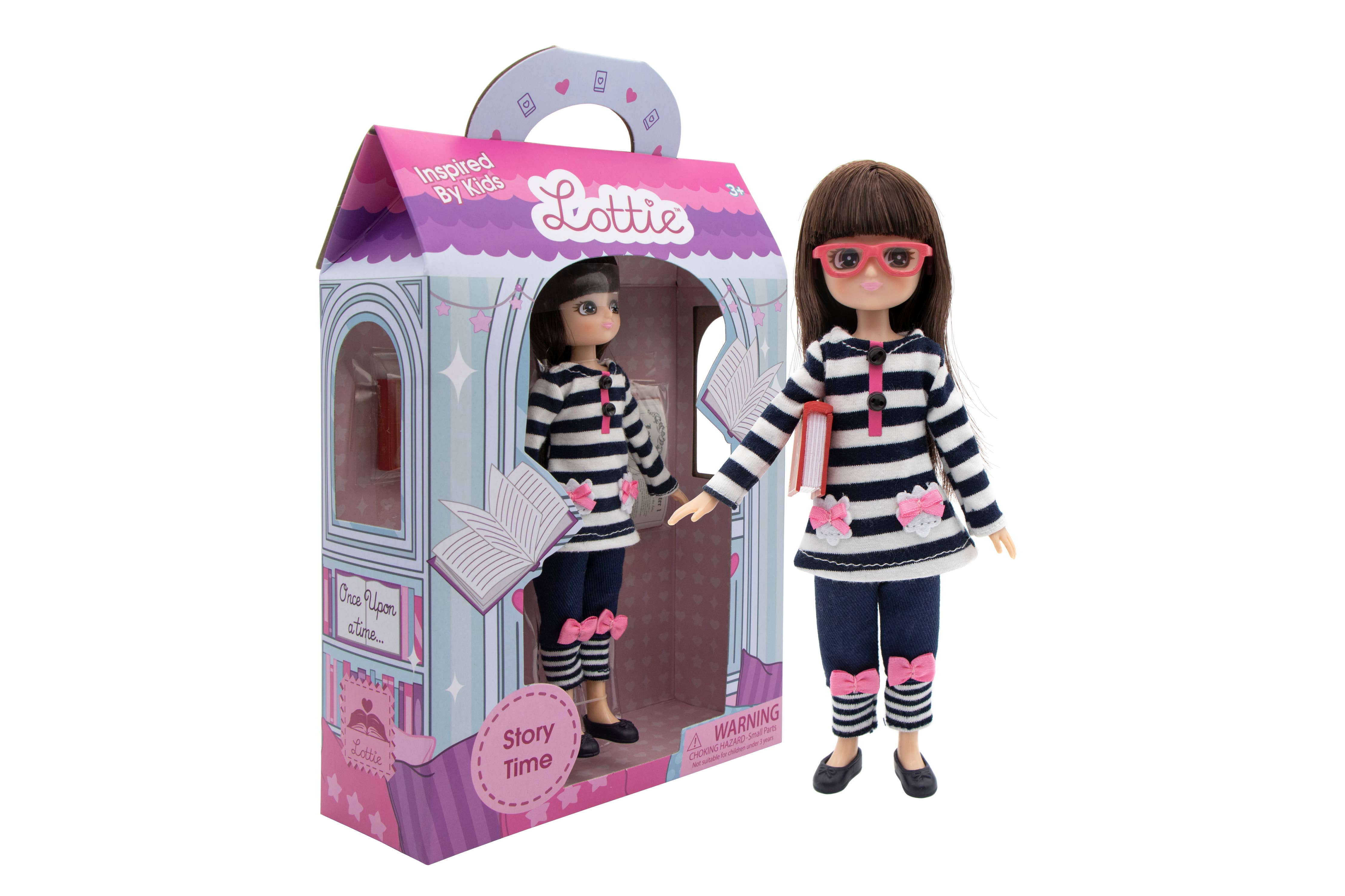 Lottie Story Time loves to curl up by the fire with her favourite book. She wears a comfortable long-sleeved striped outfit set with adorable pink bows and navy shoes.