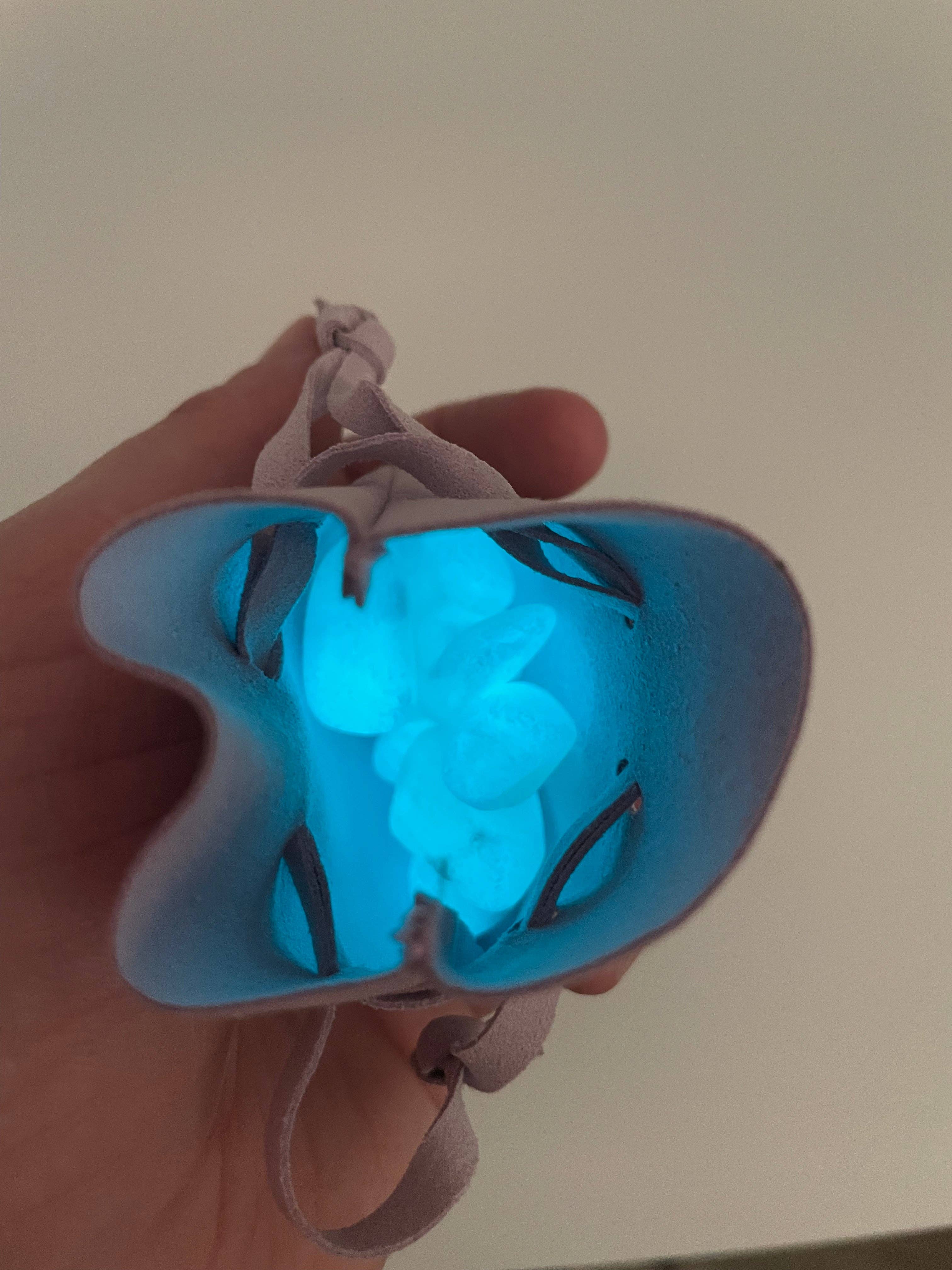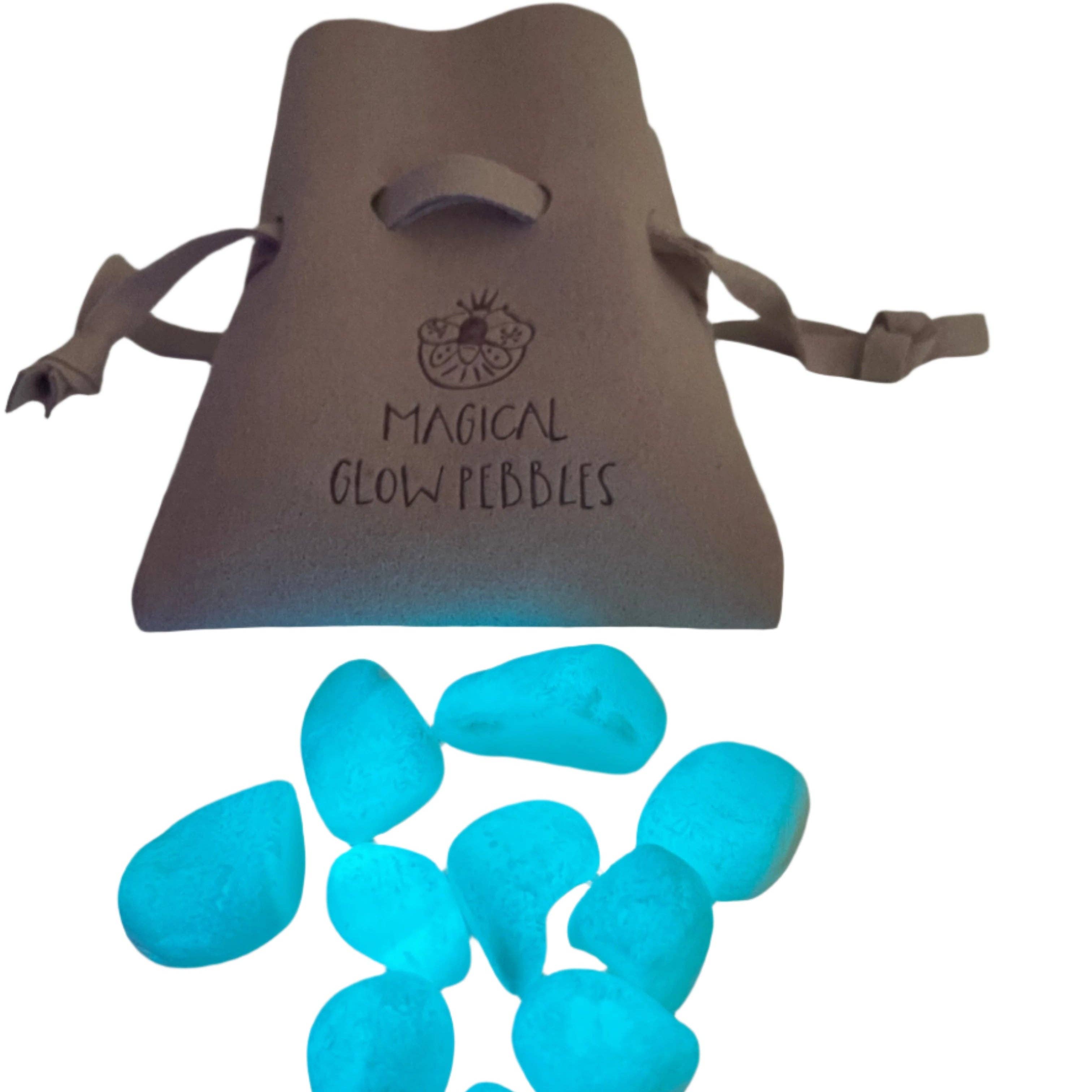 - Includes 10 blue pebbles (approx. 8–15 mm each, size may vary) in a soft violet microfiber pouch engraved with the words "Magical Glow Pebbles".