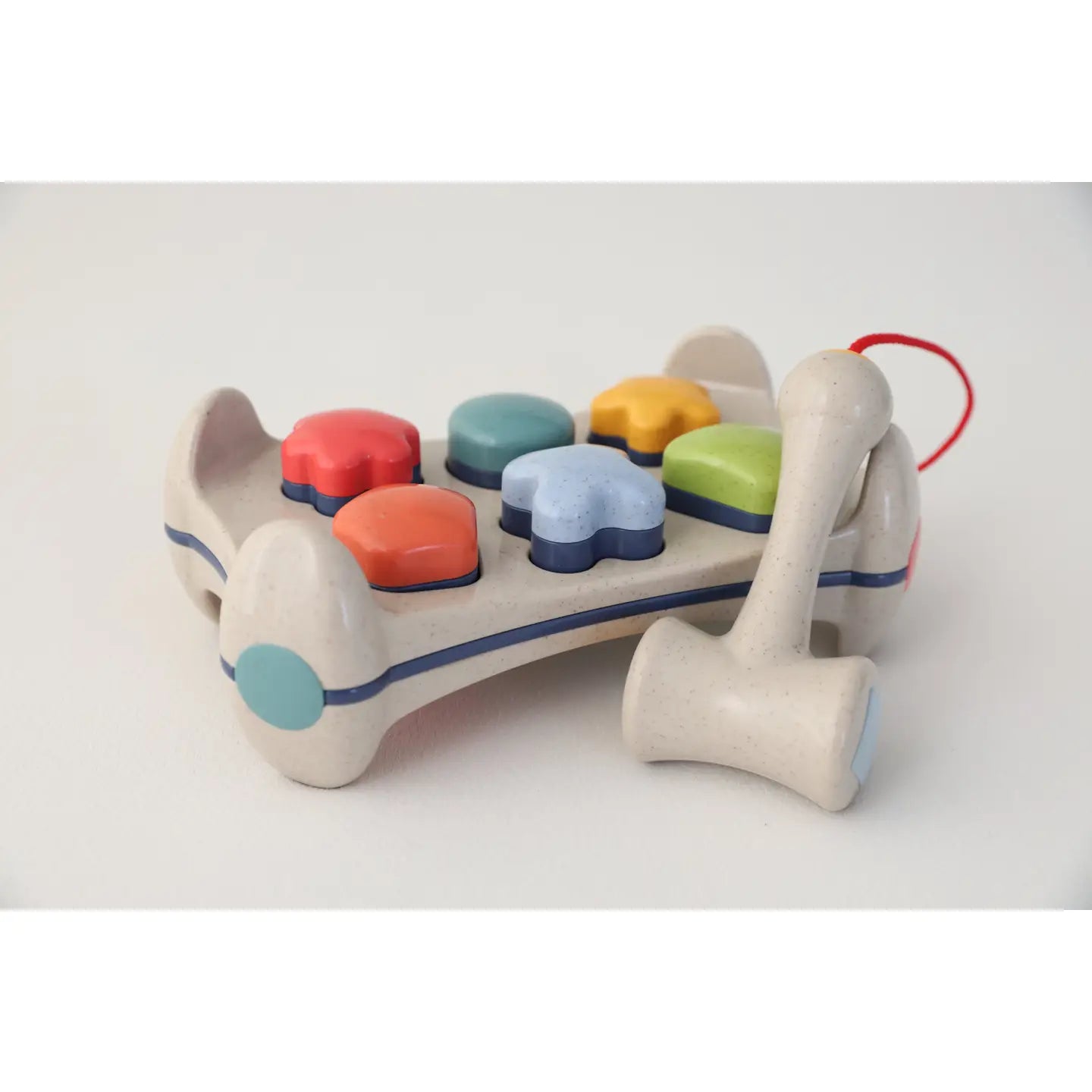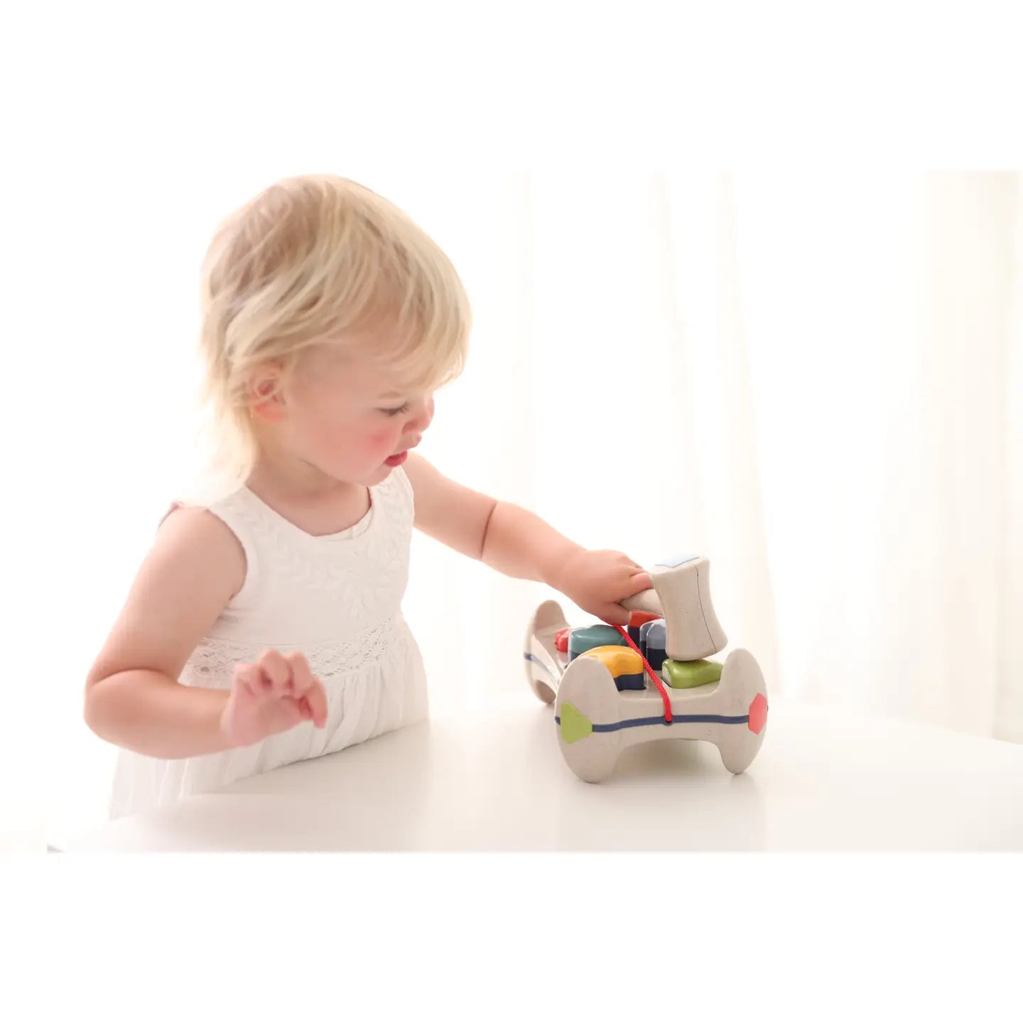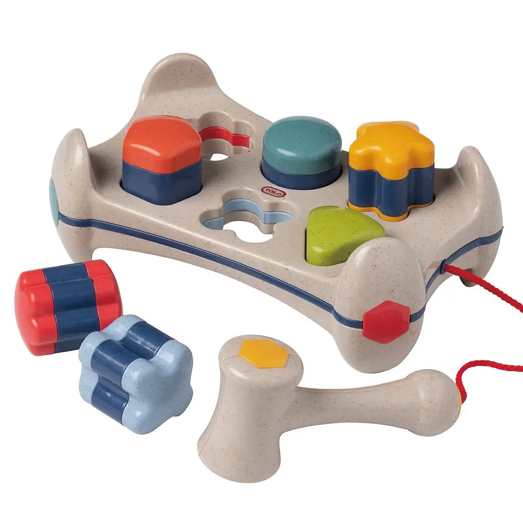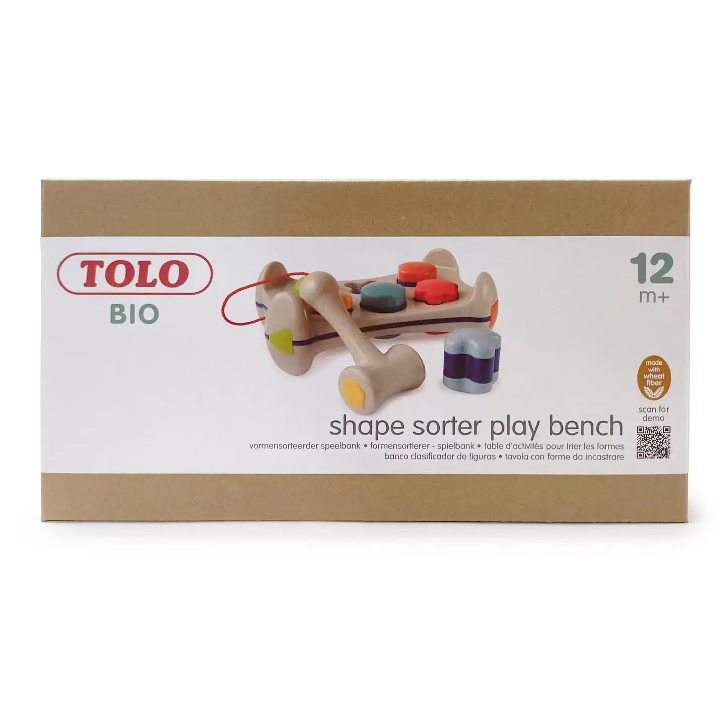 From the TOLO Bio collection, this fun Shape Sorter Play Bench develops your little one manipulation skills along with color and shape recognition. Shapes can be hammered straight through, but turn it over and you can start again! Each shape rattles with an individual sound. Baby learns both shape sorting and color matching. Hammer is attached for safe keeping.