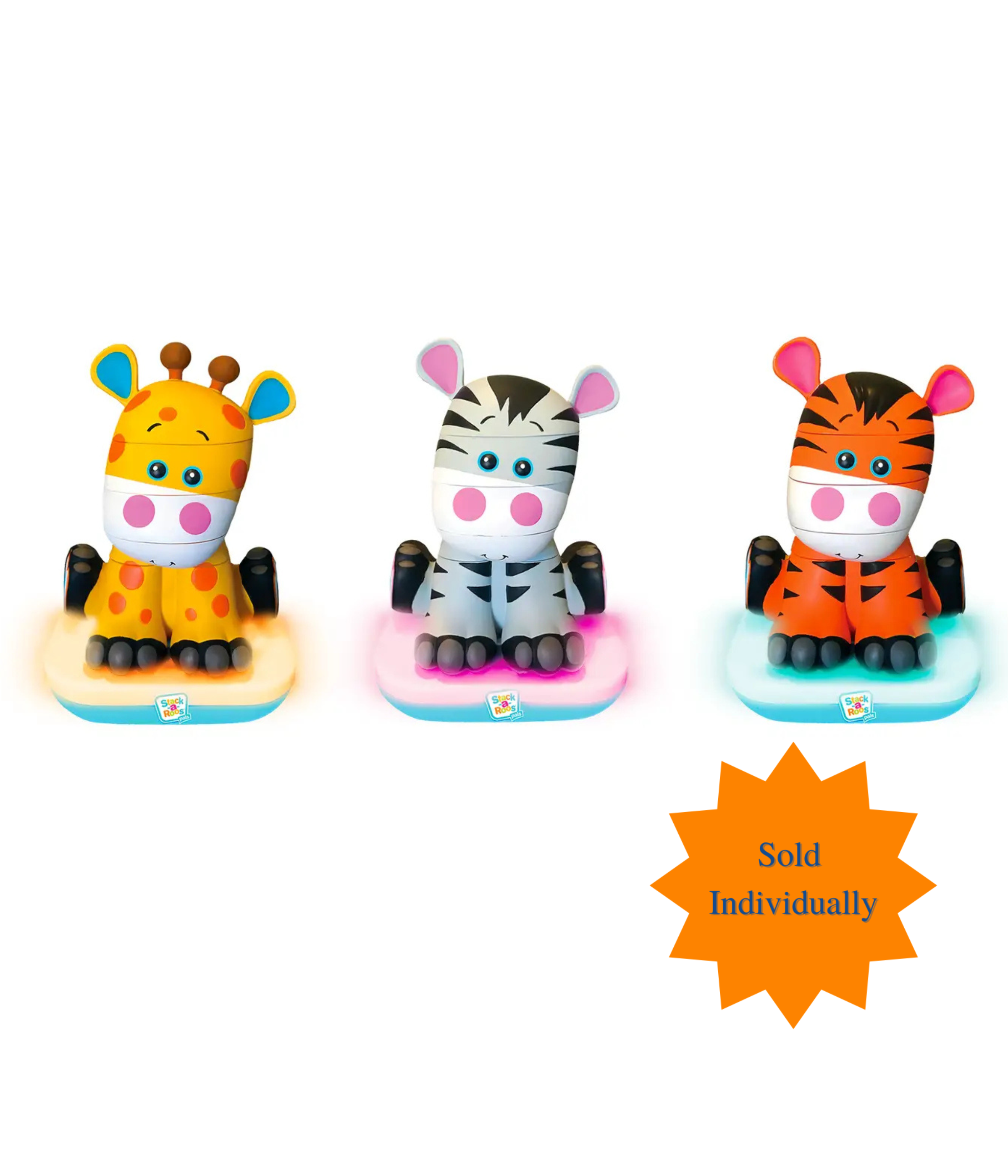 Get ready to stack! A new twist on the classic infant stacking toy, Stack-a-Roos™ lets your child stack pieces together to create a fun and adorable new animal friend! includes all your child’s favorite zoo animals – a tiger, giraffe and zebra! These stacking toys will encourage kids to stack, build and learn. Watch your child’s face fill with delight when they stack the pieces in the correct order and are rewarded with the base lighting up and triumphant music. The more your child plays, they will learn to recognize patterns and develop their fine motor skills, as well as foster counting skills. Stack-a-Roos pals are durable early learning toys that are built to last. These toys are BPA and Phthalate-free and fully safety tested. These sweet, musical toys will keep your child entertained for hours. Stimulates fine motor skills and sensory development in boys and girls ages 12 months and up.