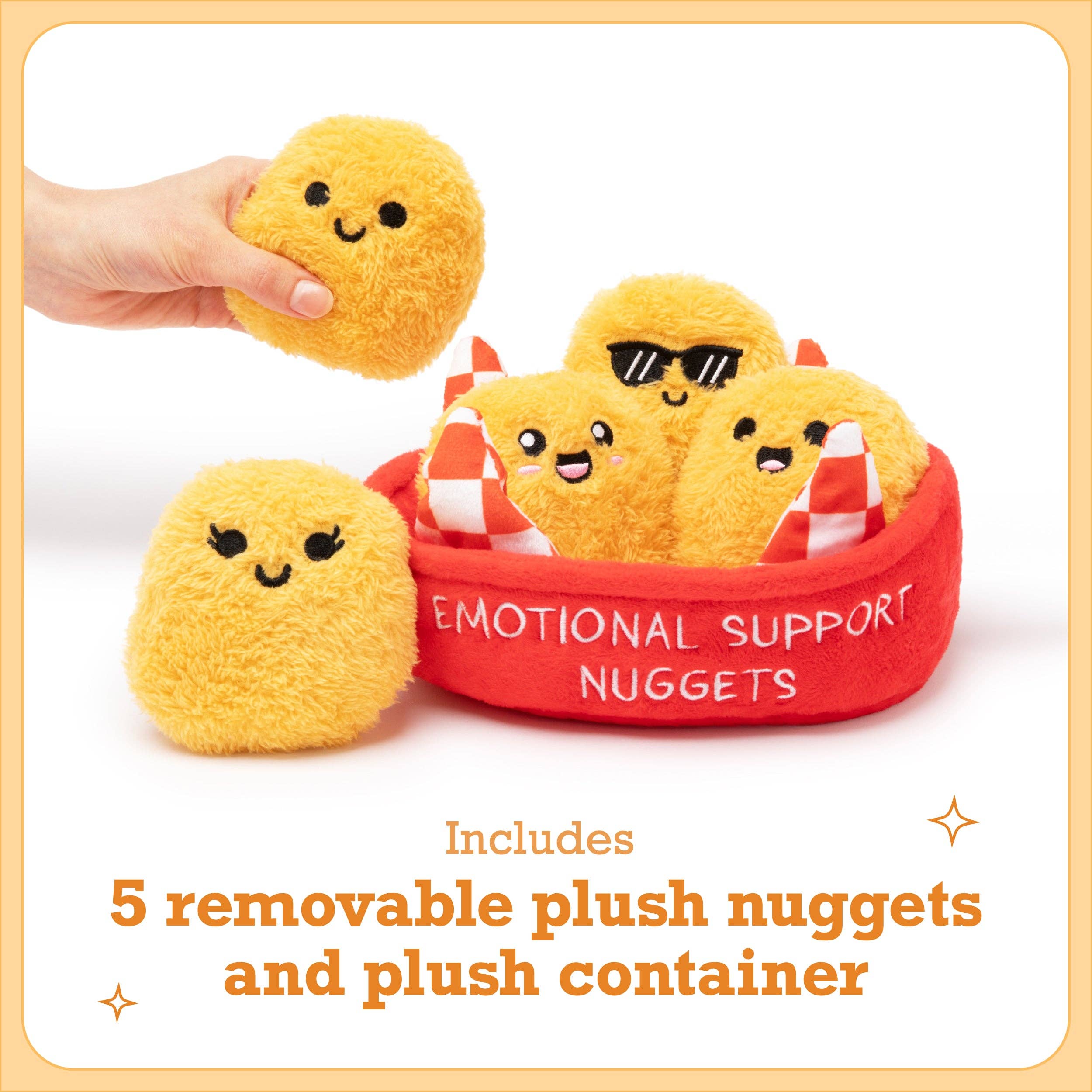 Set of 5 chicken nuggets in plush container.