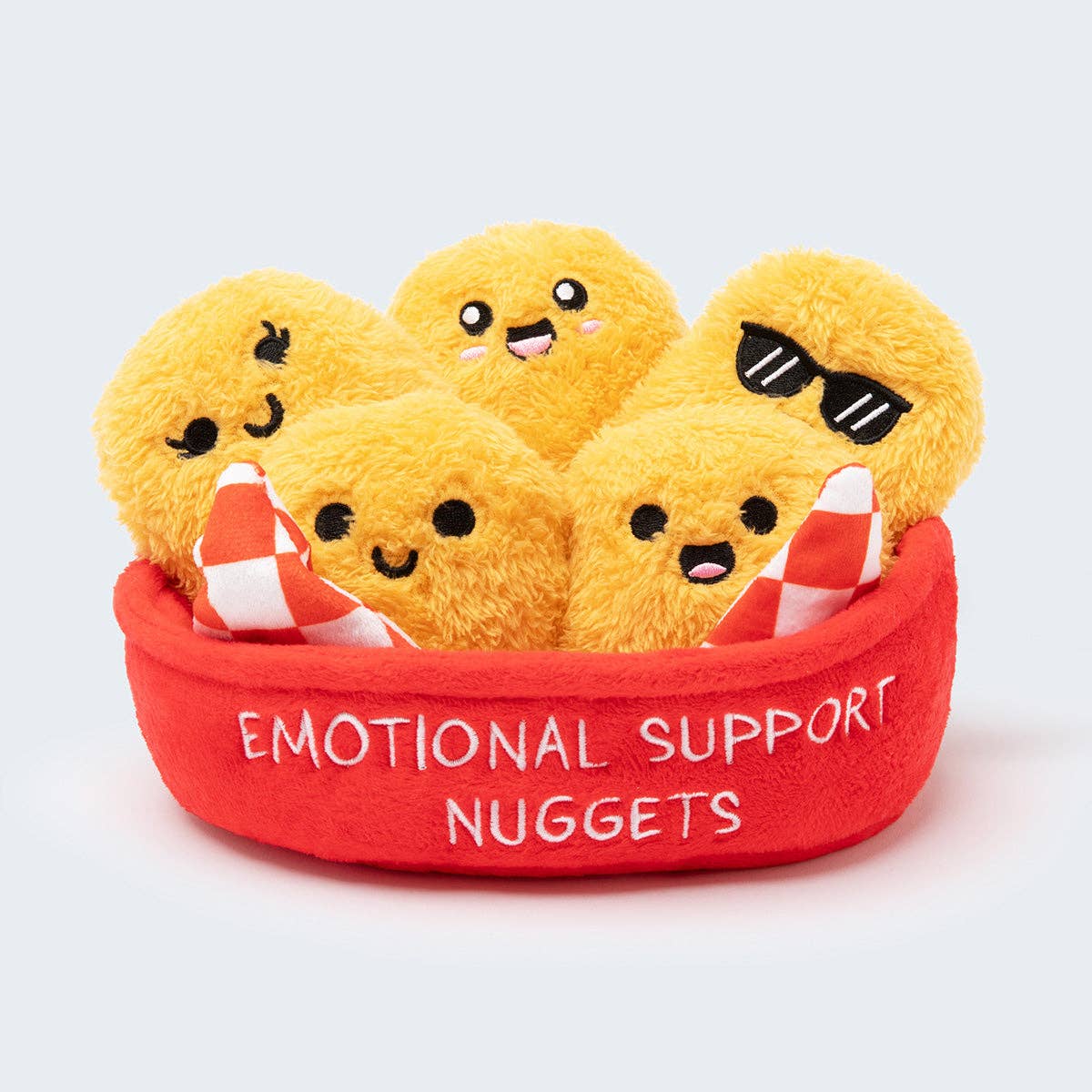 Emotional Support Nuggets are the squishy versions of your favorite pals. Enjoy spending time together, no matter whether you're out on the go or snuggled up at home. Includes 1 cozy container and 5 individual plush mushrooms. Each funny character comes with its own name, personality, and expression. Choose a favorite or take the whole crew with you.
