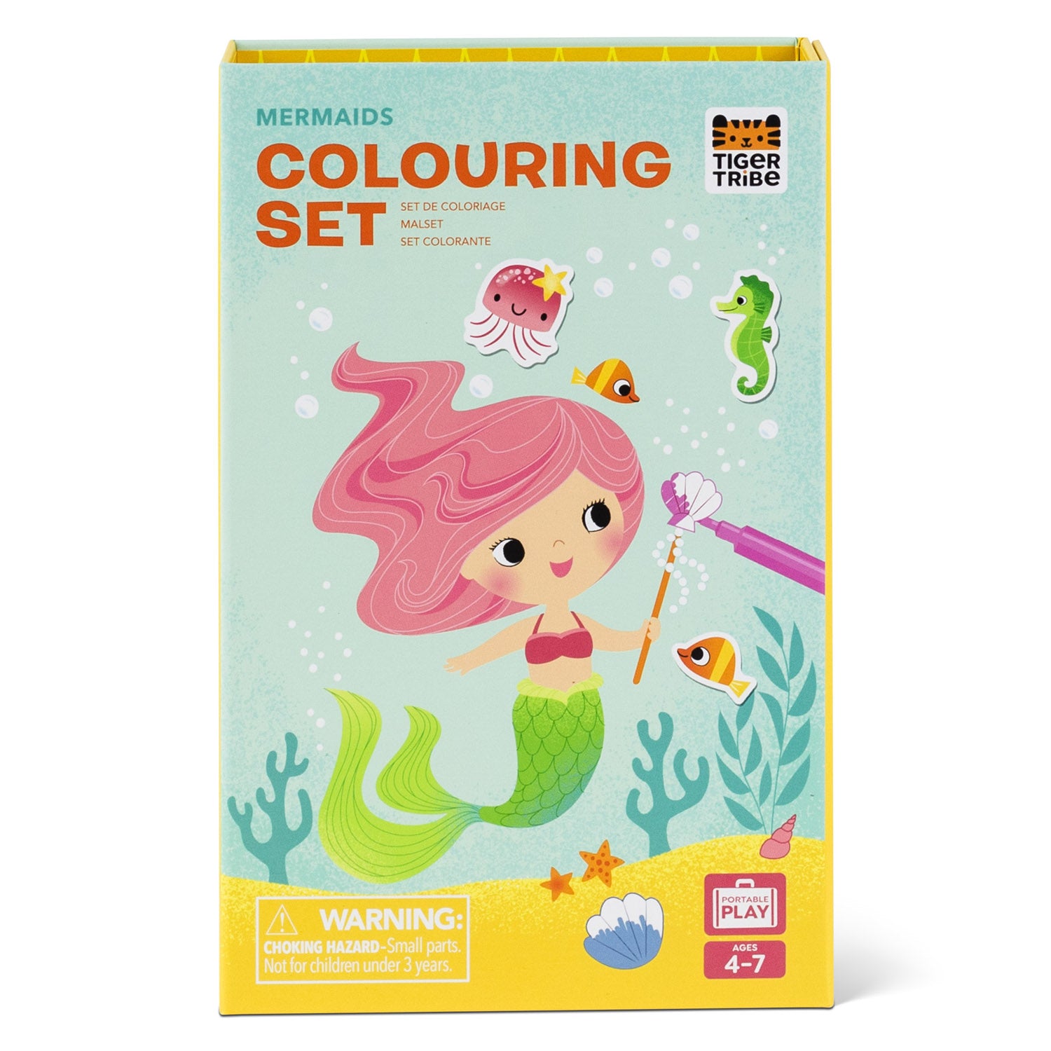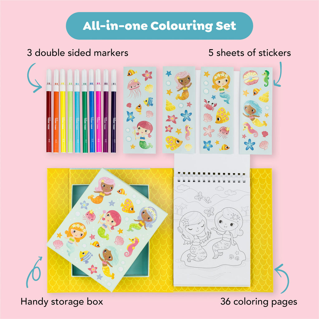 Kids will love this coloring set featuring Mermaids and magical underwater fantasy worlds. Includes 10 vibrantly colored markers and 40+ stickers that will elevate every artwork to fridge-worthy status. Complete in our sturdy, magnetic-sealed case perfect for kids on the go.