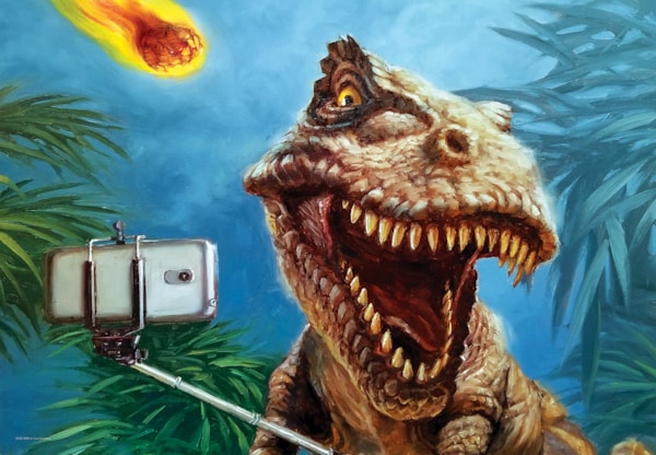 Dive into a unique blend of prehistoric history and modern humor with the Dino Selfie 100-piece puzzle by Eurographics. This captivating jigsaw puzzle features a T-Rex in a moment of pure vanity, perfectly posing for a photo using a selfie stick and a smartphone.