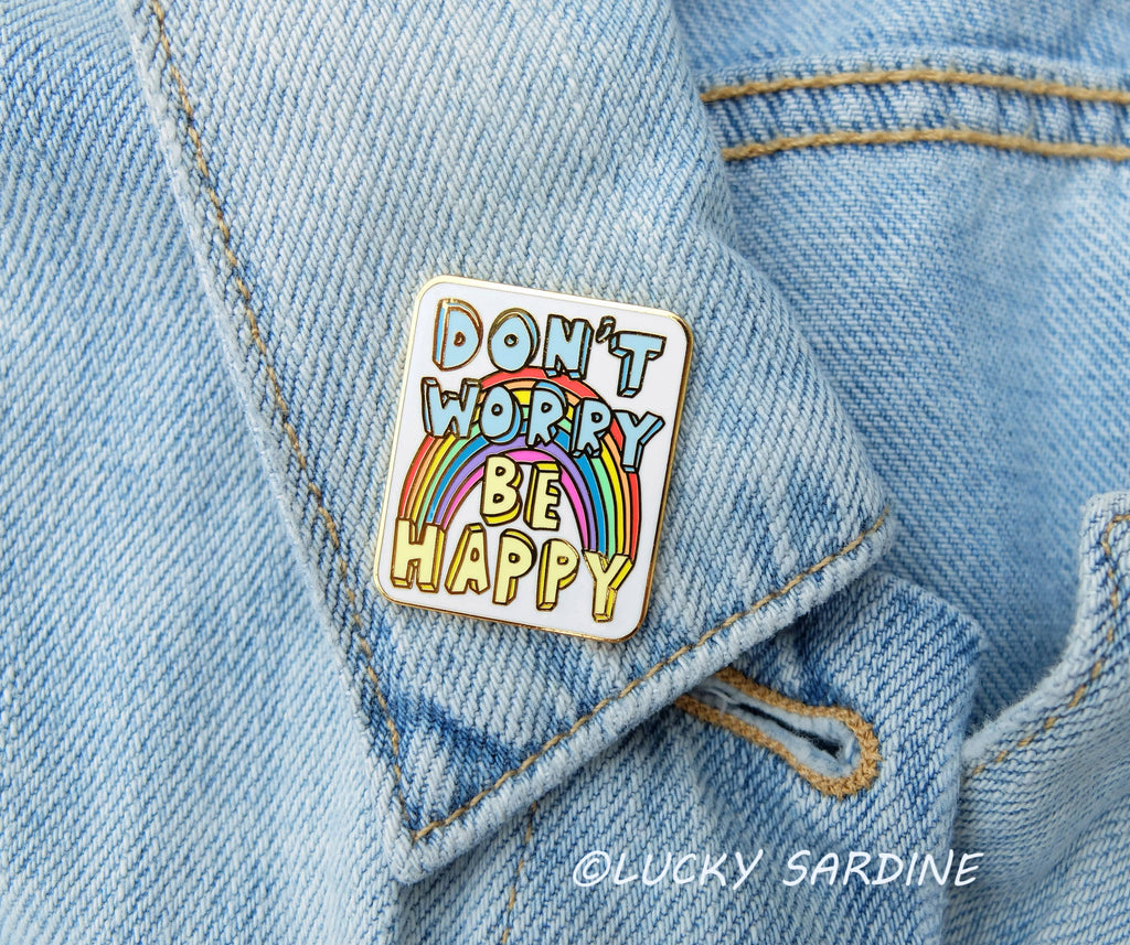 Don't worry be happy, rainbow pin. *1" wide x 1.25" tall, hard enamel with gold plating. *Two back posts with black rubber backing.