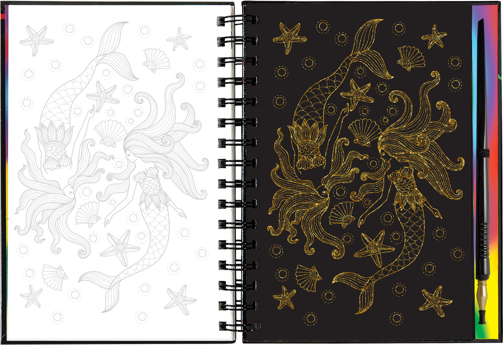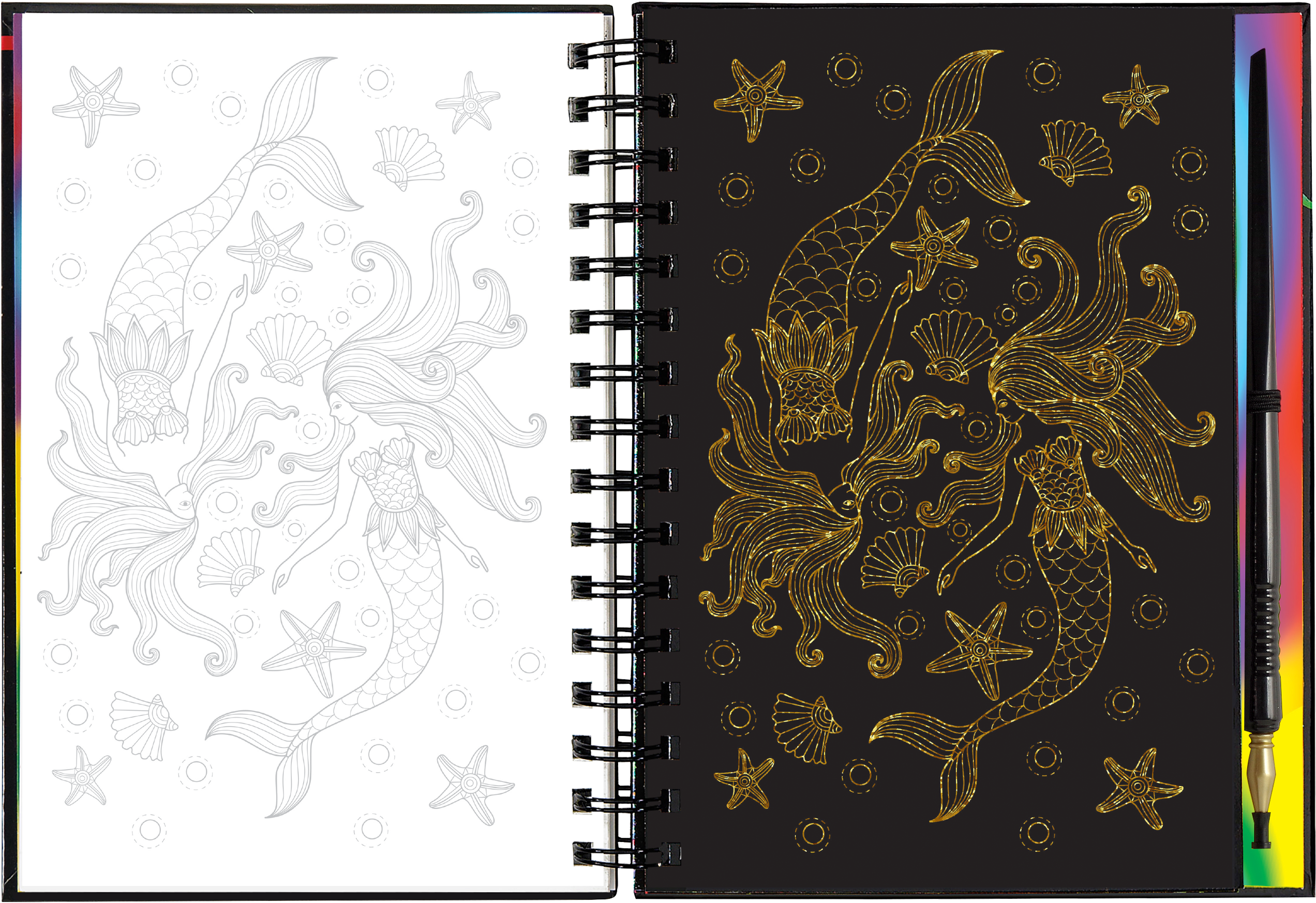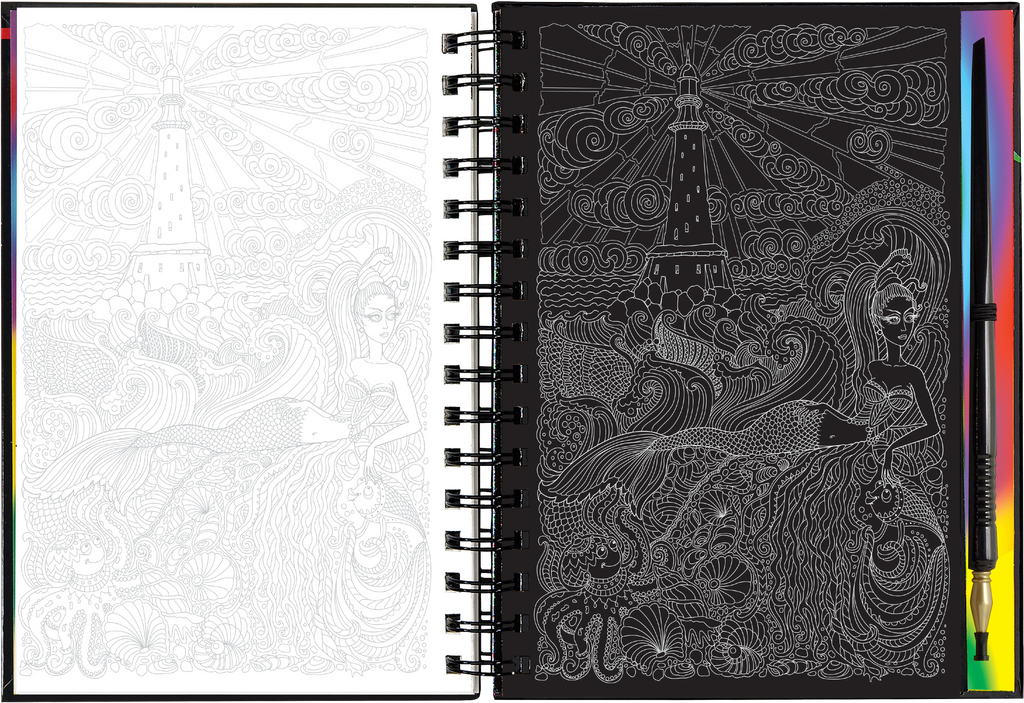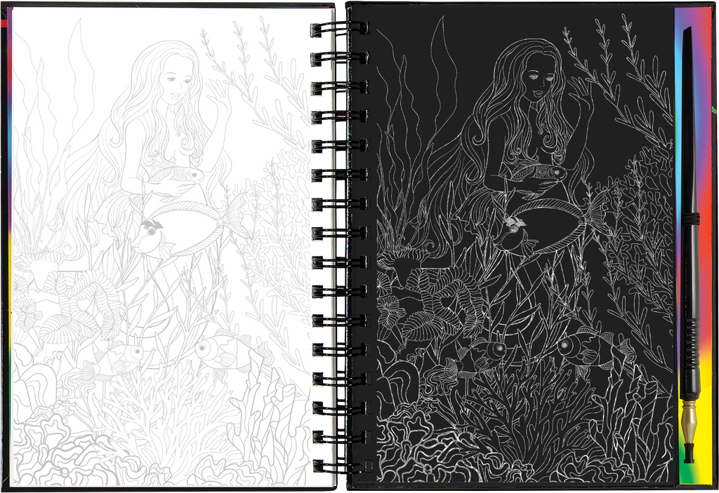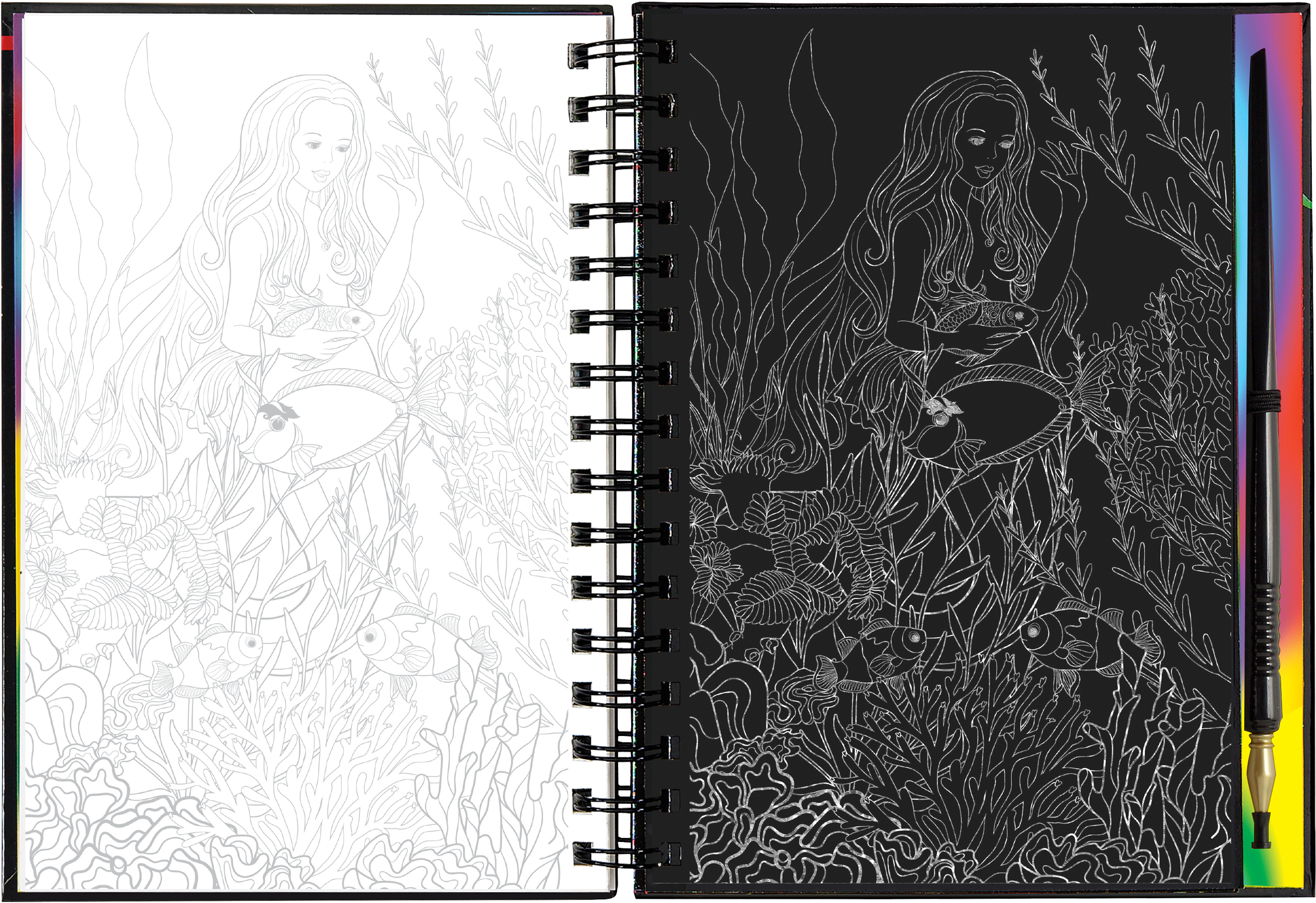 Dive into a mystical world filed with intricate mermaid designs! Discover 20 dazzling deep-sea scenes filled with mermaids ready to be brought to life in dazzling color! Use the super-fine stylus included to trace the white lines on each right-hand black-coated page, uncovering mermaid designs that sparkle and shine in gold, silver, teal, or rainbow glitter! The left-hand mermaid coloring pages are ready for you to get extra creative with markers or colored pencils. 20 bonus pages are included in the back for your own independent drawing and sketching.
