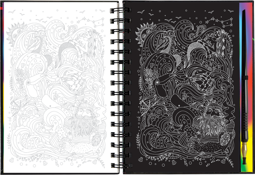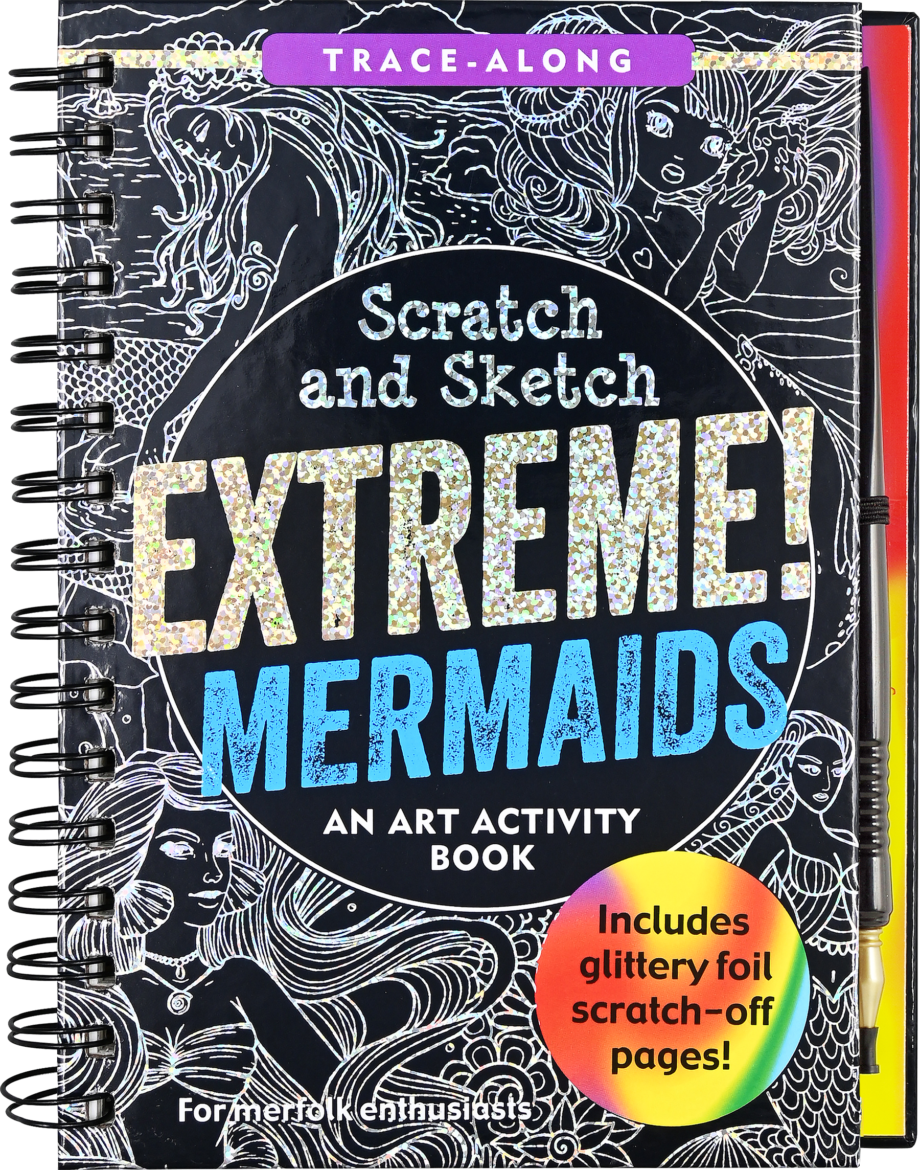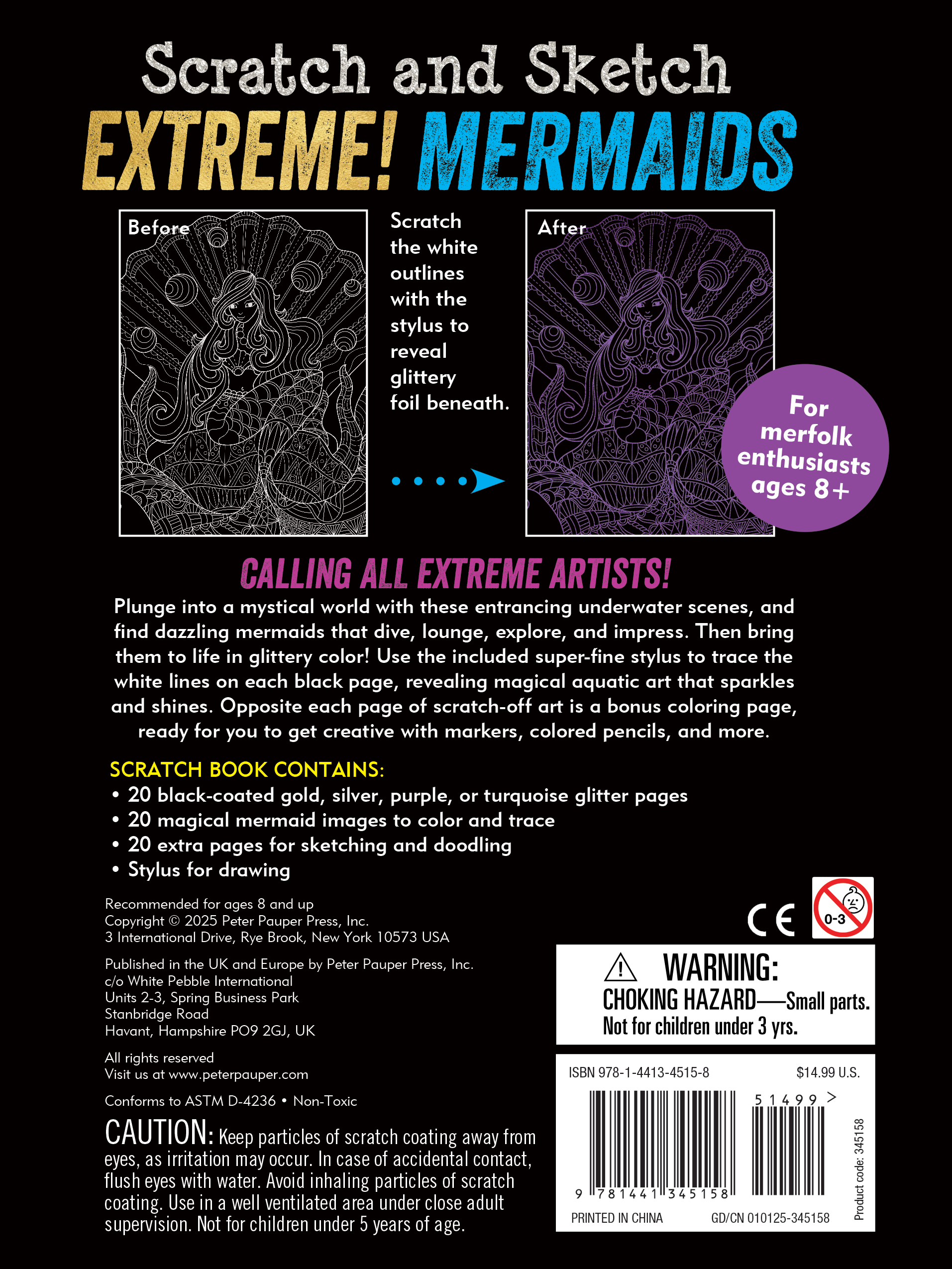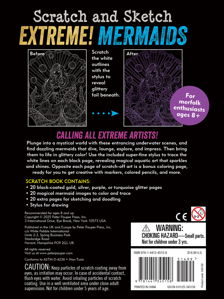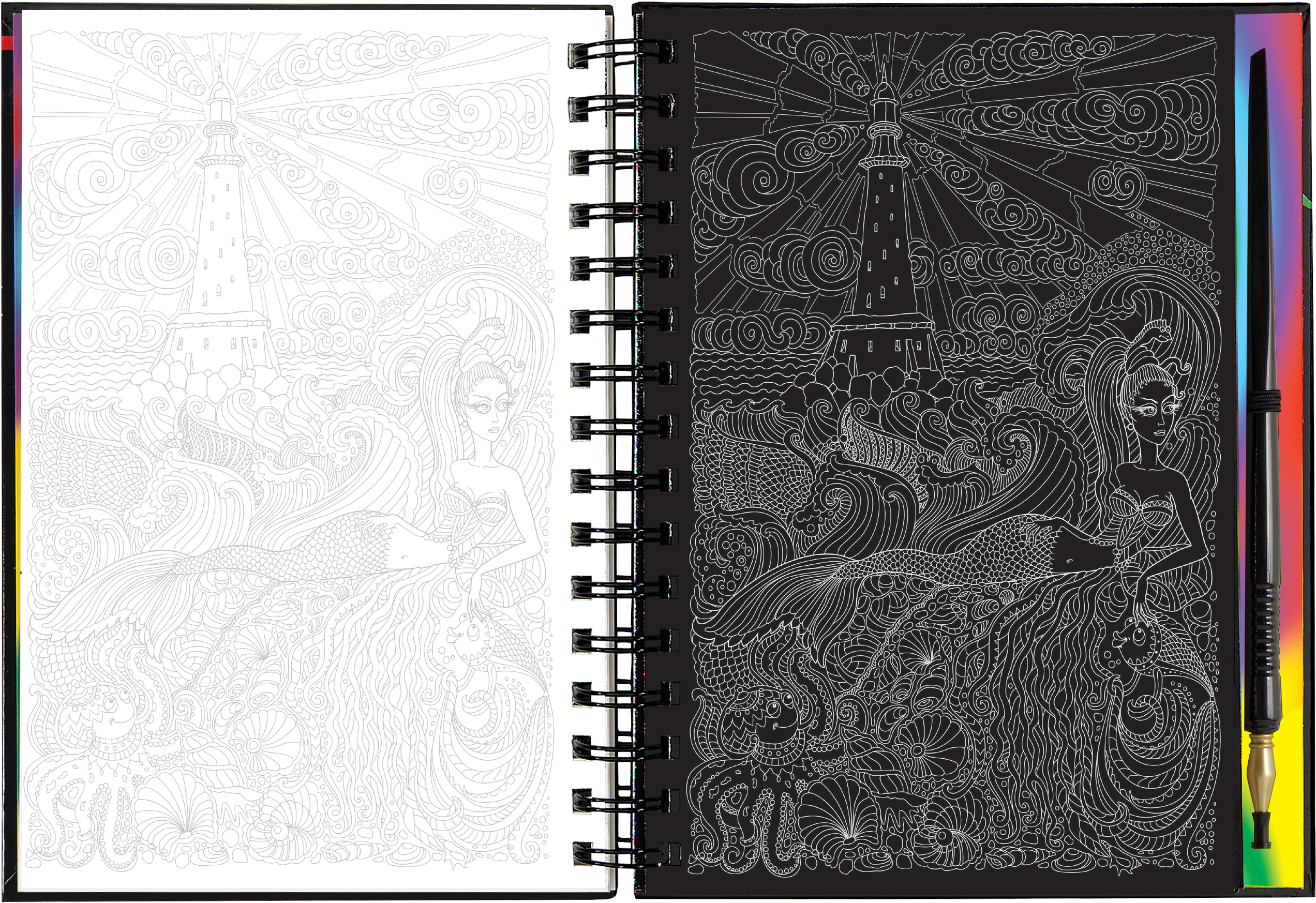 Dive into a mystical world filed with intricate mermaid designs! Discover 20 dazzling deep-sea scenes filled with mermaids ready to be brought to life in dazzling color! Use the super-fine stylus included to trace the white lines on each right-hand black-coated page, uncovering mermaid designs that sparkle and shine in gold, silver, teal, or rainbow glitter! The left-hand mermaid coloring pages are ready for you to get extra creative with markers or colored pencils. 20 bonus pages are included in the back for your own independent drawing and sketching.