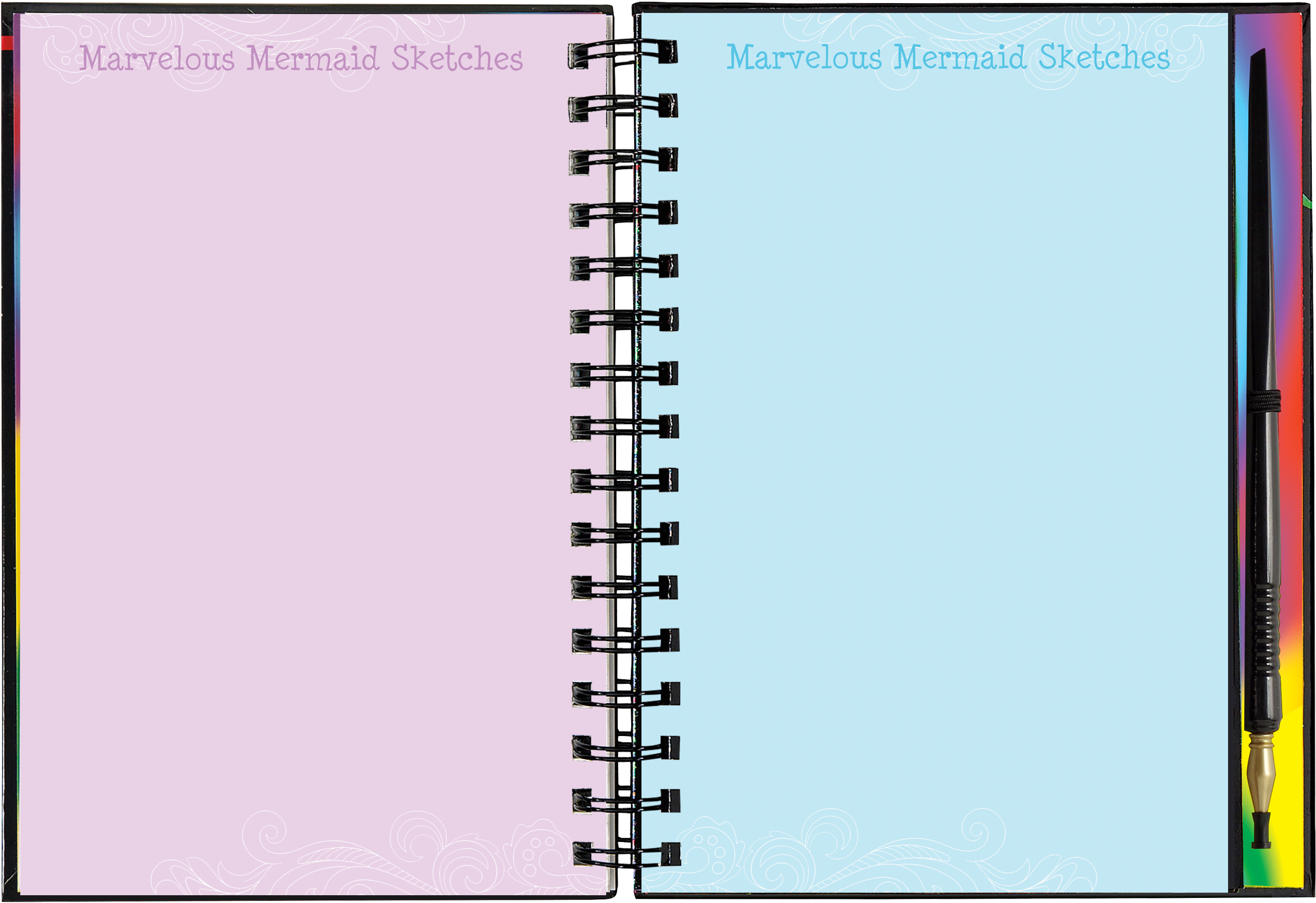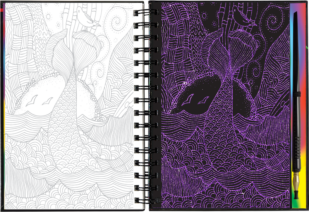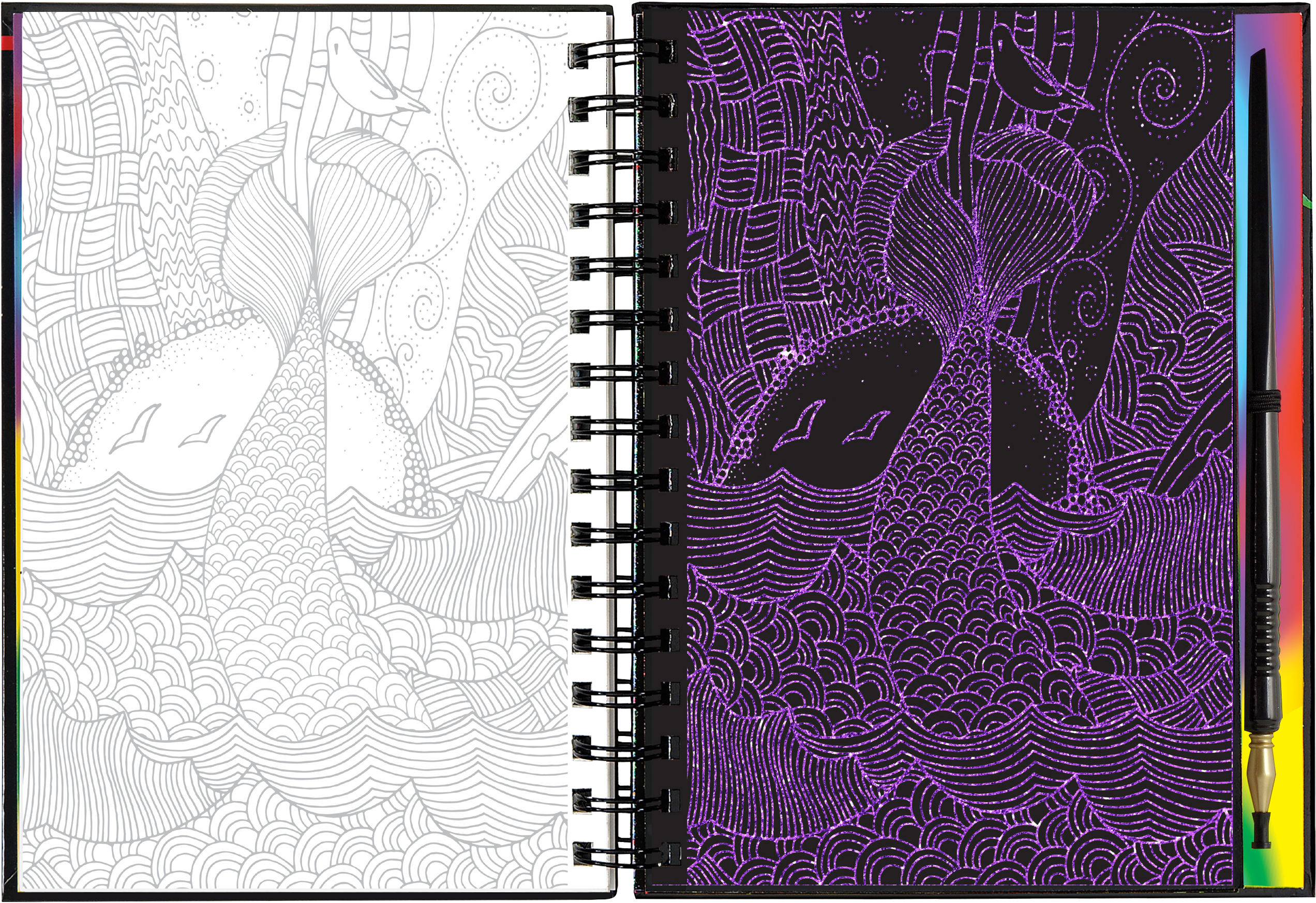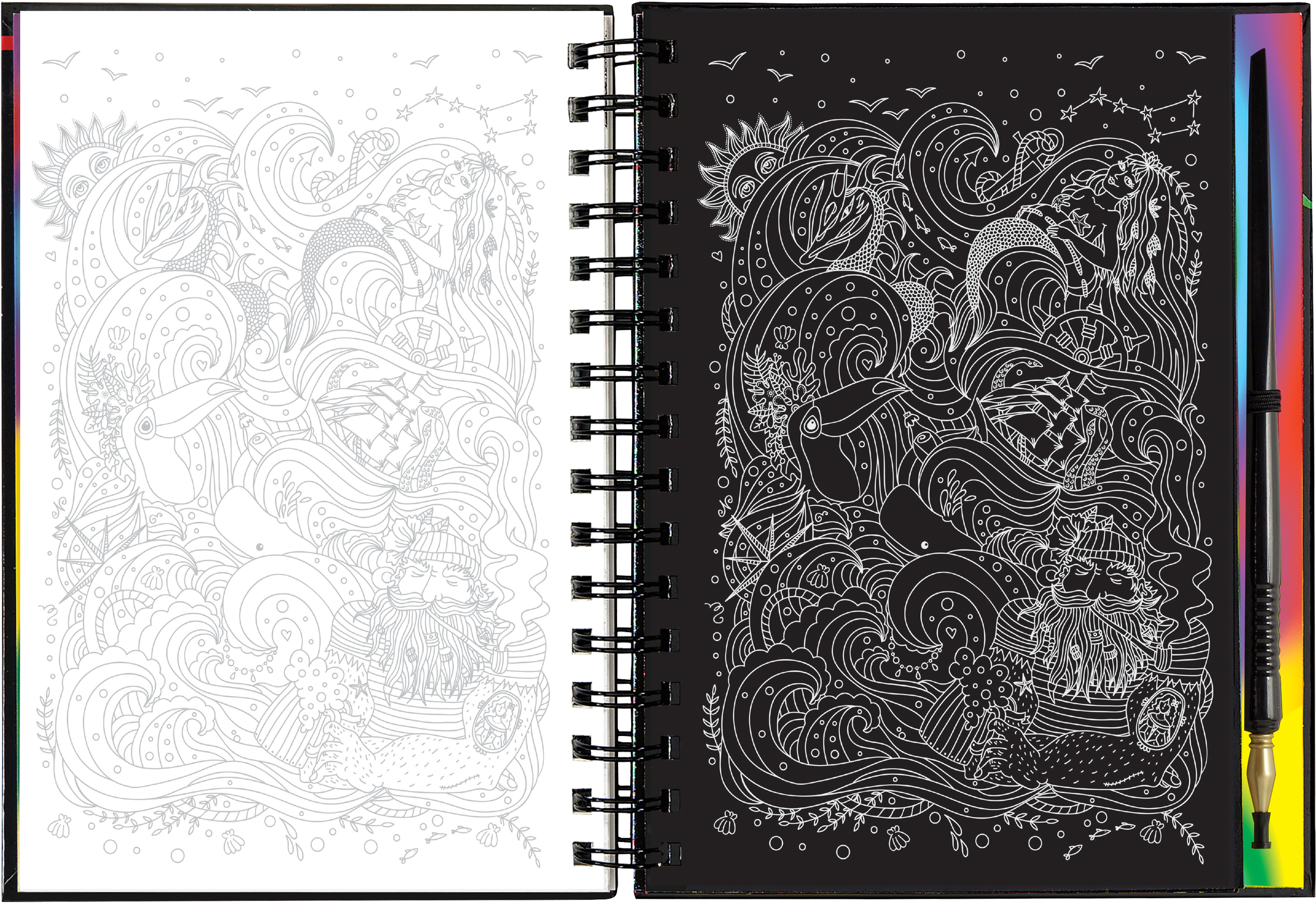 Dive into a mystical world filed with intricate mermaid designs! Discover 20 dazzling deep-sea scenes filled with mermaids ready to be brought to life in dazzling color! Use the super-fine stylus included to trace the white lines on each right-hand black-coated page, uncovering mermaid designs that sparkle and shine in gold, silver, teal, or rainbow glitter! The left-hand mermaid coloring pages are ready for you to get extra creative with markers or colored pencils. 20 bonus pages are included in the back for your own independent drawing and sketching.