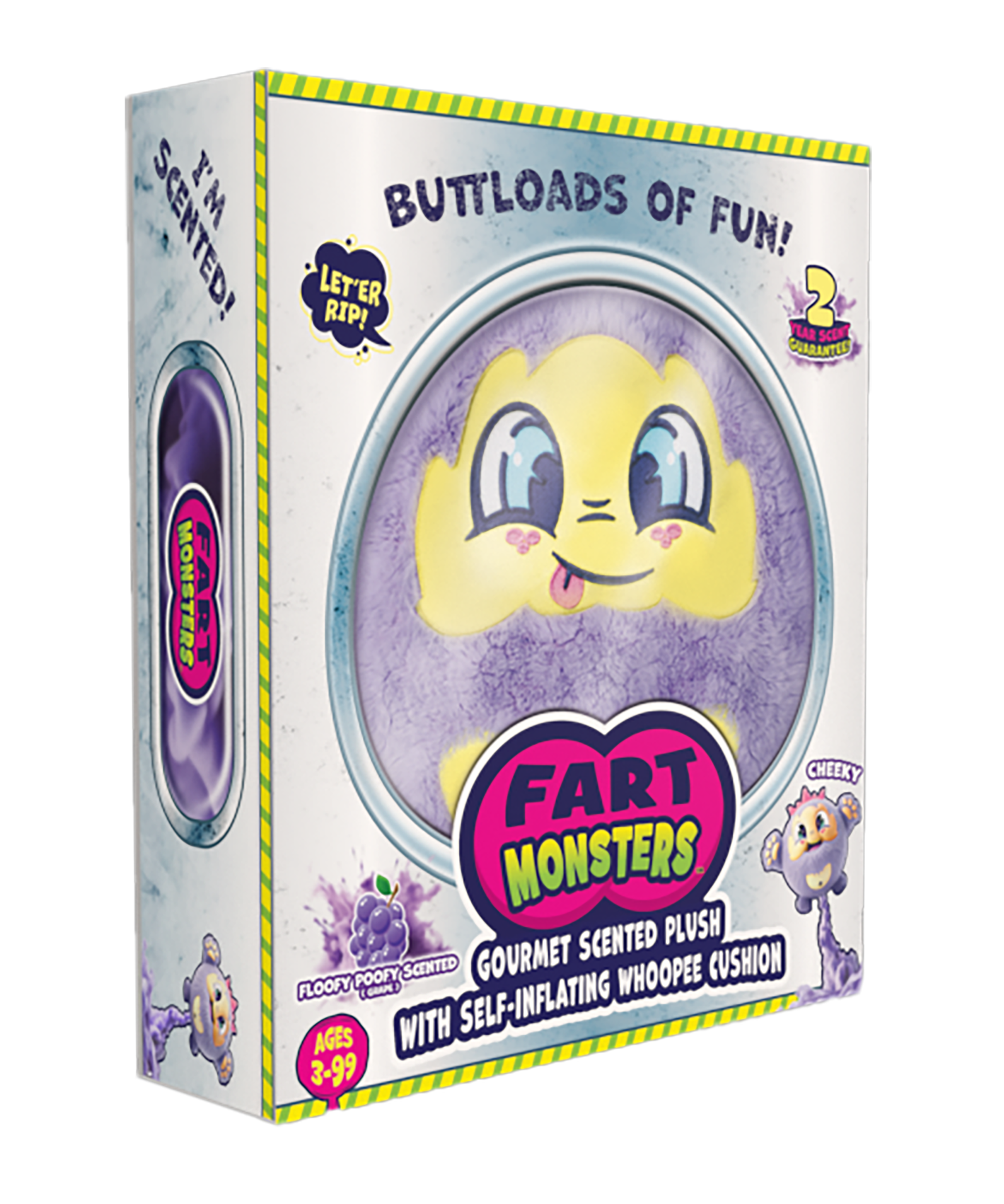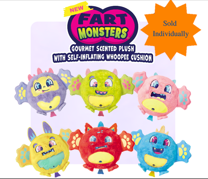 Fart Monsters: Squeezable Plush Toys That Sell Themselves! Get ready to giggle, squeal, and gas up the room (in a good way). These plush buddies are on a mission to blast boredom away with every whoopee-powered toot. Meet the gang: Cheeky, Fizzler, Squeeky, Tootles, Windy, and Zipper. Each one is stuffed with soft plush, a gourmet scent, and a self-inflating whoopee cushion that lets out a silly sound when you squish, squeeze, or sit on 'em. Bring laughter, surprise, and a little aroma to playtime. Bright, bold, and hilarious, Fart Monsters release the fun for everyone. Product Details: 15" Gourmet Scented Plush: A substantial, huggable size. 12" Self-Inflating Whoopee Cushion: Ensures continuous, silly sound effects. Soft Polyfill: For a perfectly squishy feel. 6 Styles & Scents: Offer variety and collectibility with Grape, Lemon Lime, Bubblegum, Tutti Frutti, Pineapple, & Cherry.