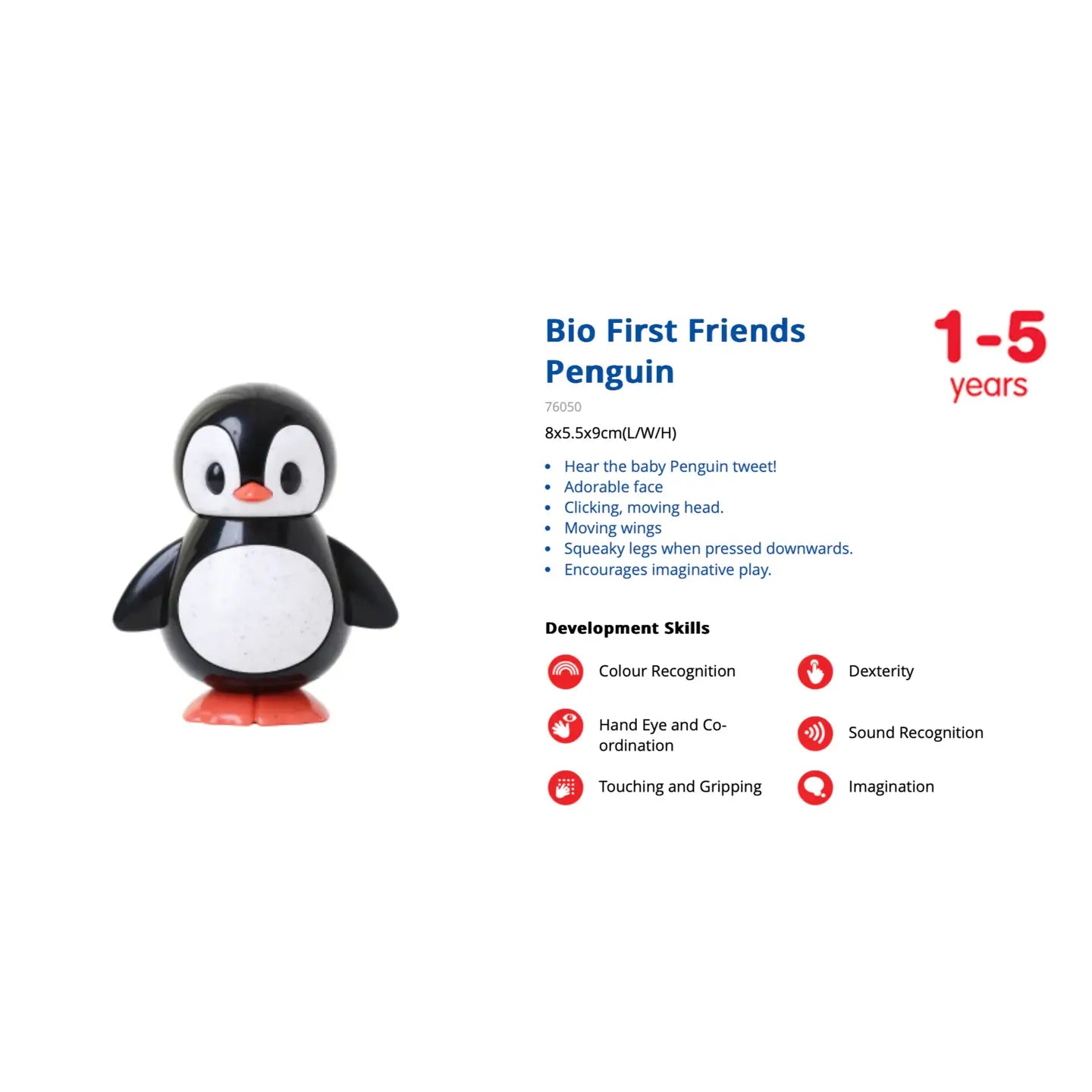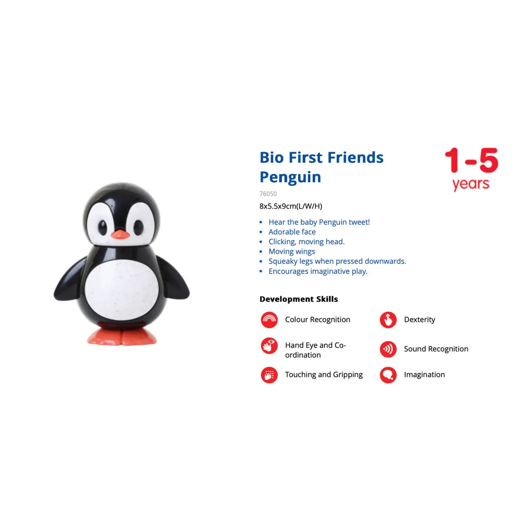 Meet Your Child's New First Friend: The Penguin! Bring joy and learning together with the First Friends Penguin, the ideal companion for your child's early years (1-5). Watch as your little one forms a special bond with this charming penguin toy! Main Features: Interactive Play: Stimulate your child's imagination with interactive play sessions alongside their new penguin friend. Educational Value: Encourage learning through play as your child explores colors, shapes, and textures Safe Materials: this toy is made from high-quality ABS and wheat straw materials, prioritizing your child's safety.