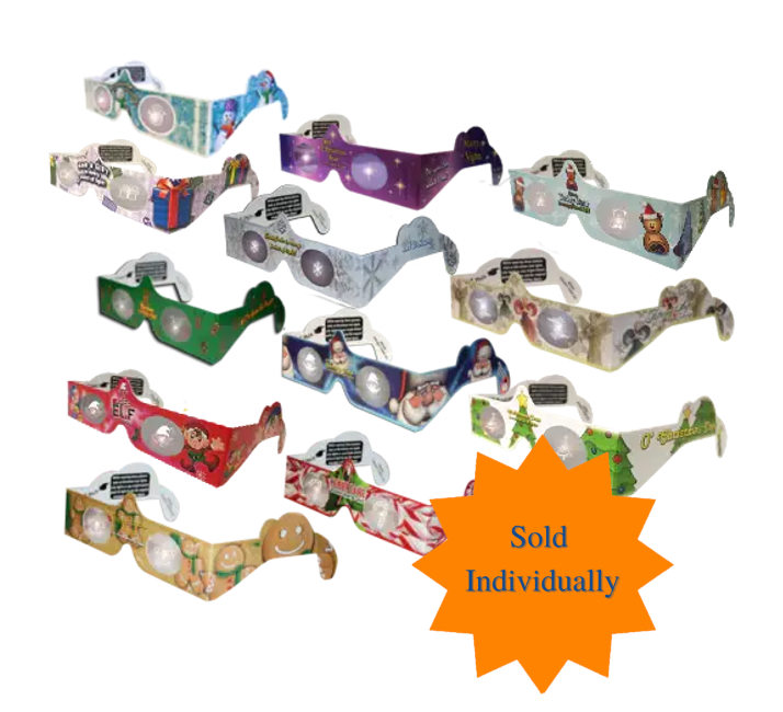 Be amazed this holiday season as our patented lenses transform ordinary holiday lights, city lights, street lights, and more into magical holiday images. Its absolutely amazing! Holographiclenses bend light creating magical images on each bright point of light, providing an optical experience like youve never seen before! These amazing paper glasses are perfect for gifts, stocking stuffers, holiday parties, teacher/student gifts, fundraising and more! Holiday fun for everyone!