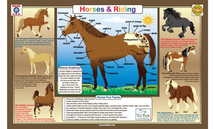 A horse is a large plant-eating domesticated mammal with solid hoofs and a flowing mane and tail, often used for riding, racing, and to carry and pull loads. Use Tot Talk's "Horses and Riding" placemat to learn more about the horse, the different breeds, and how to correctly measure a horse. Learn what a female, male and young horse are called. On the back side, you may learn the differences between English and Western riding styles and how you tie up a horse. Get a rope and practice yourself! Giddyup! Recommended age: 4 and up Tot Talk Placemats are: • MADE IN USA • Safety-Approved • Award Winning • Anti-bacterial - Wash with dish soap; placemats dry quickly • Used in homes, schools and on the go, traveling or in a restaurant • Lightweight and durable • Dimensions: 17.5 x 11.5 inches