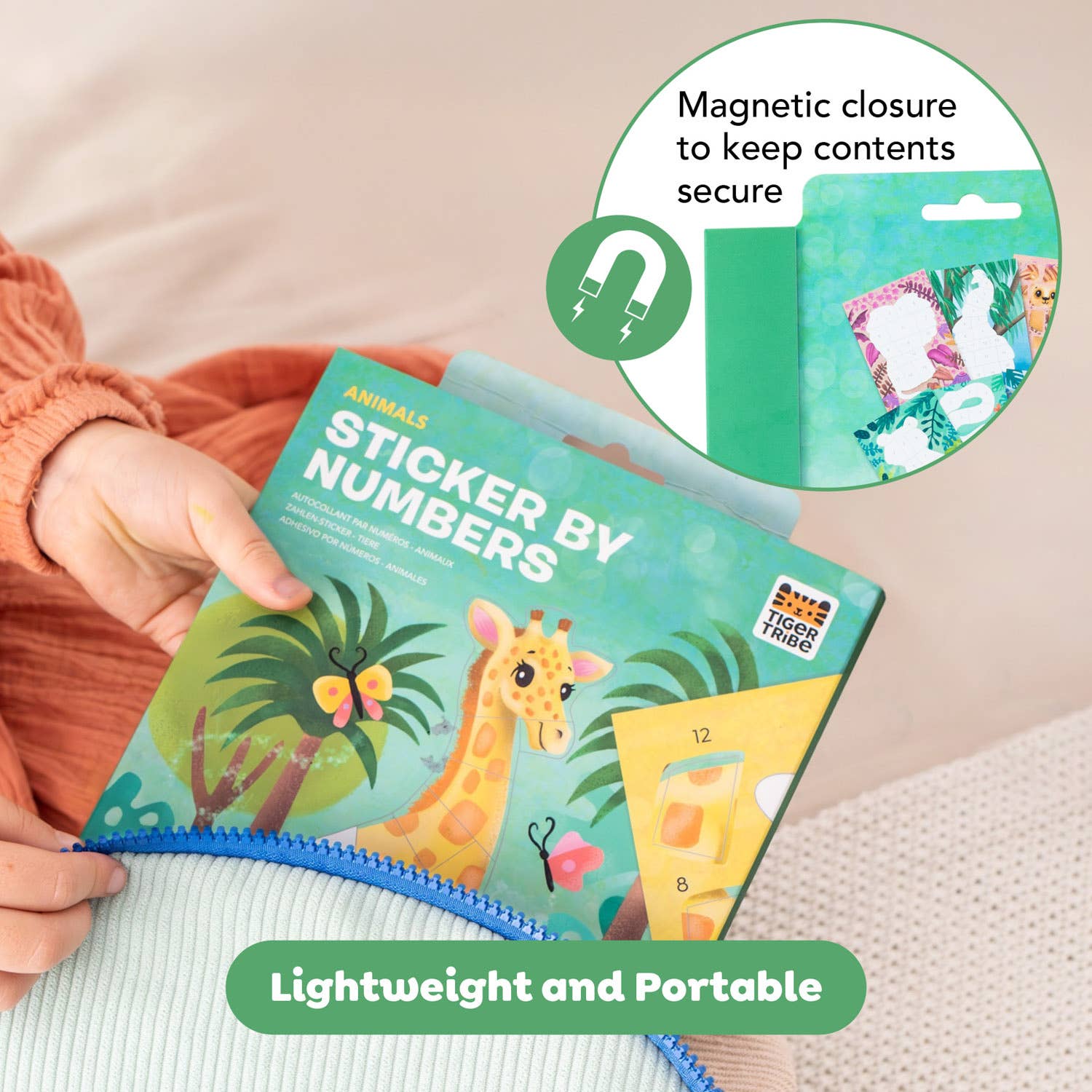 Create adorable Zoo Animals in this fun Sticker by Numbers set. Packaged in a compact, self-contained magnetic sealed case, this is perfect for kids on the go. Includes 16 unique illustrated templates, 16 numbered sticker sheets to match with artworks