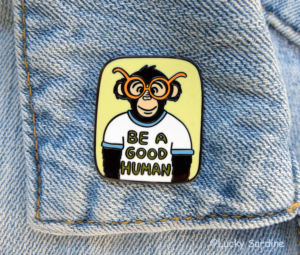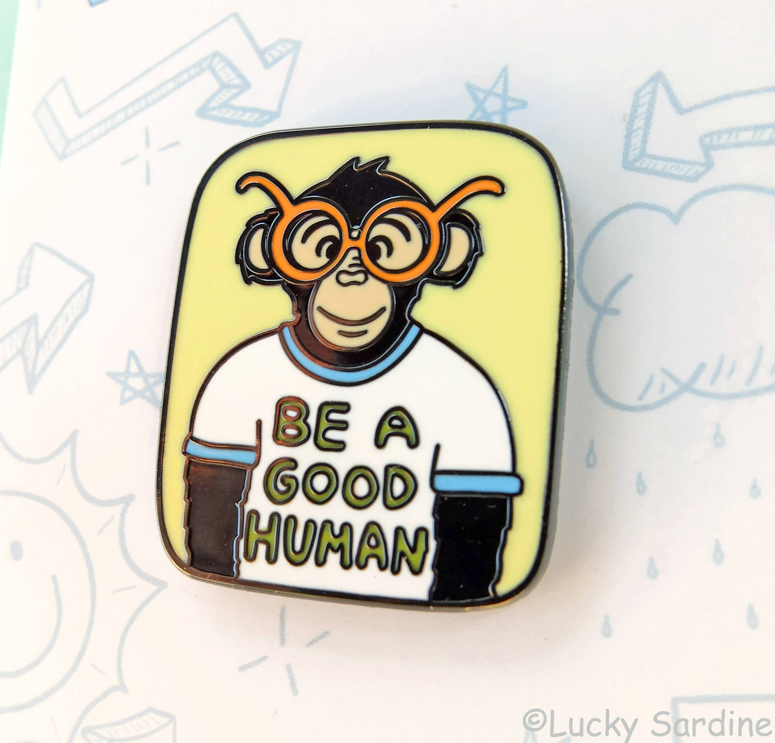 BE A GOOD HUMAN with a new yellow background. *1.25" tall x 1" wide, hard enamel with black nickel metal. *Two back posts with black rubber backing.
