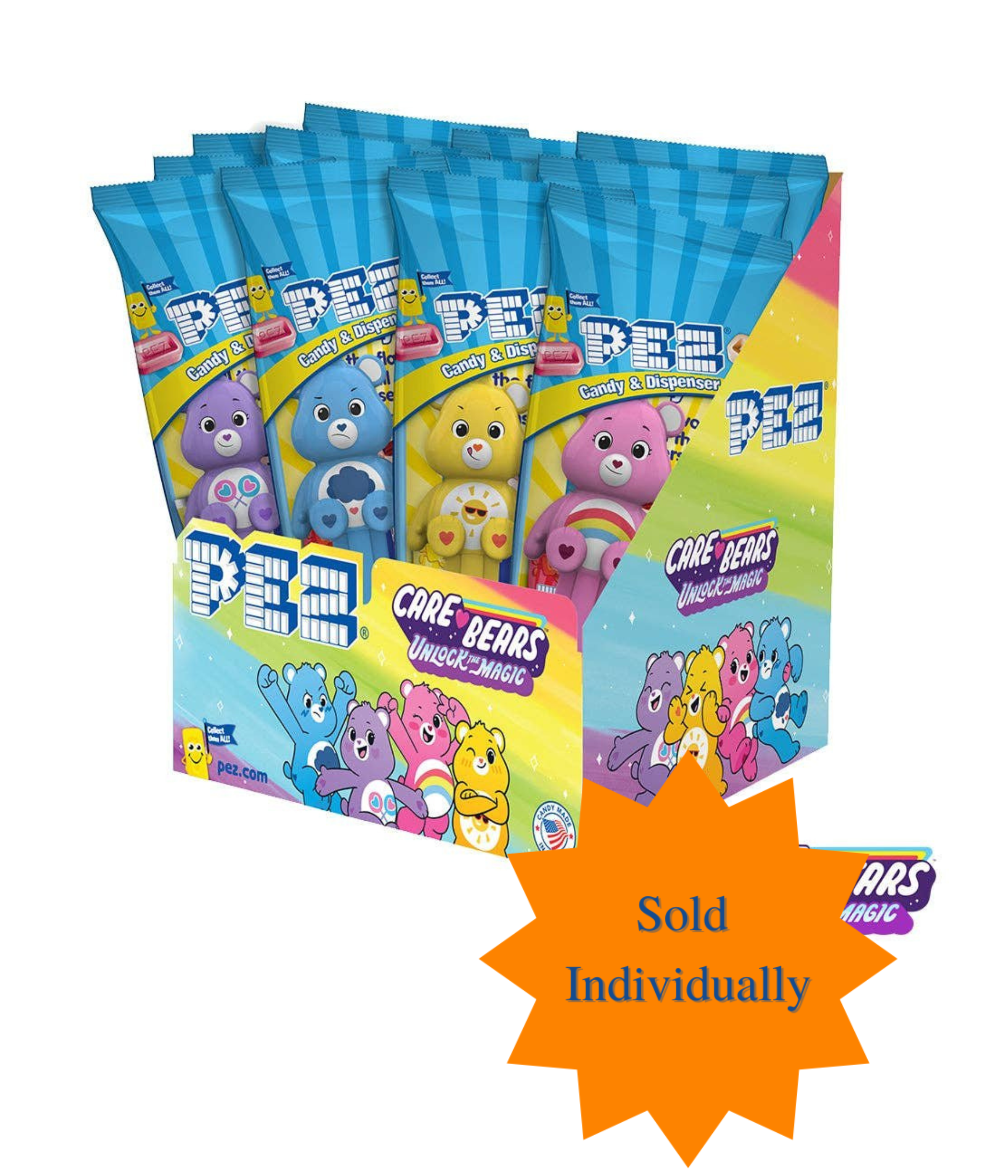 Care Bear fans will adore these Pez Dispensers. 4 fun characters to collect, Cheer, Grumpy, Share and Funshine Bear. These well know characters are loved by kids and adults alike! Each pack contains: 1 dispenser & 2 individually wrapped tubes of Pez refill sweets.