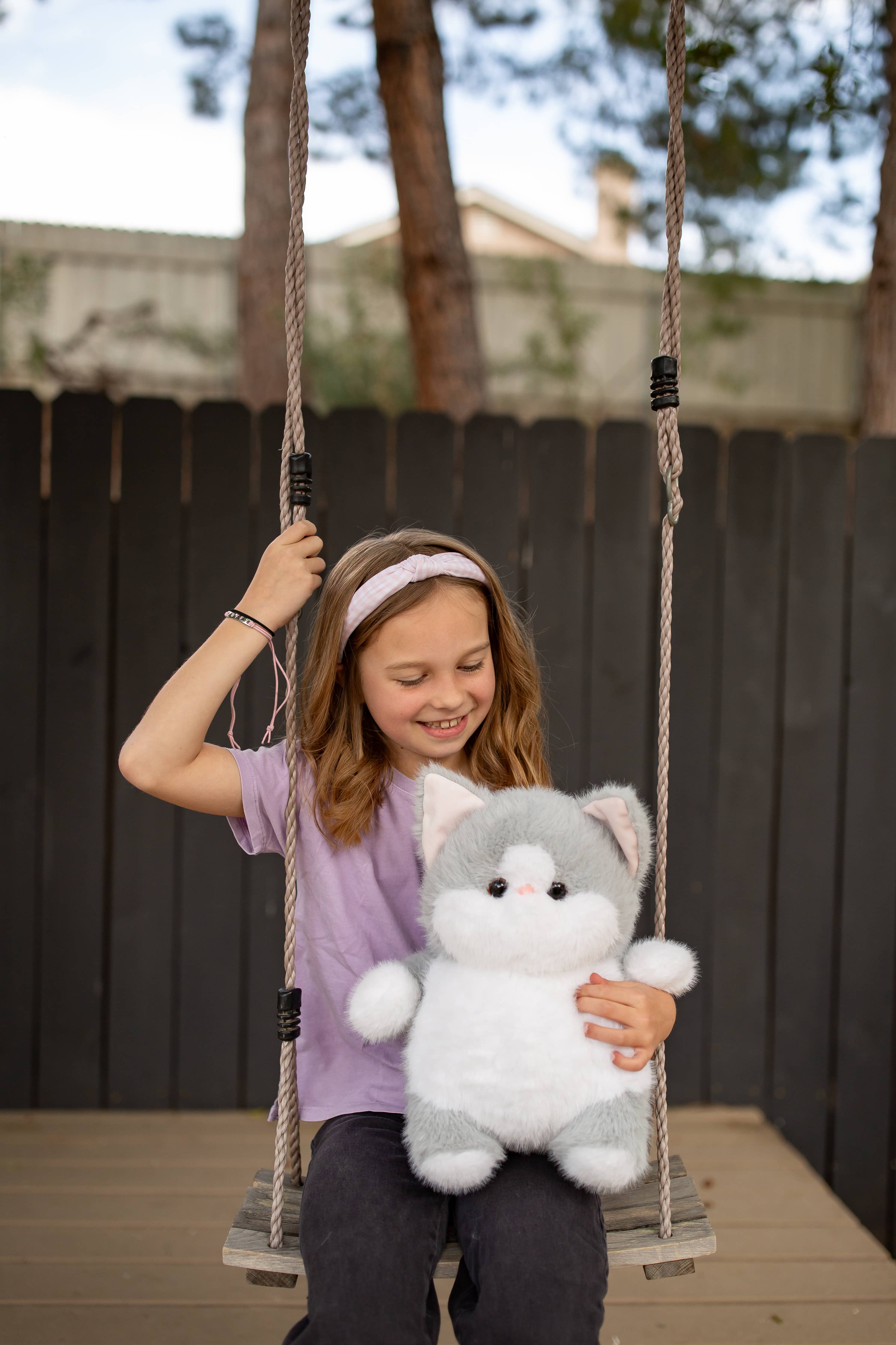 The Chunka Dunkas Kitty combines ultra-soft dual-tone plush in charcoal grey with contrasting white belly and face, irresistibly round body perfect for squeezing, sculpted-in eyes that create gentle sleepy expression, and those chubby cheeks everyone wants to pinch.