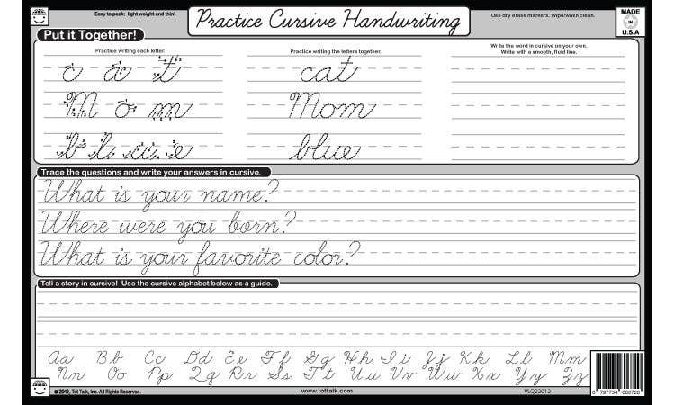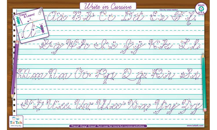 Not all schools are teaching cursive writing, but you still can insure your children know how to write in cursive. Learning to write the cursive script, a classic writing technique, is fun! Use Tot Talk's elegant Cursive Writing placemat to Learn how to write in cursive. Practice each letter and then practice writing letters together to form words. Wipe clean and practice again.