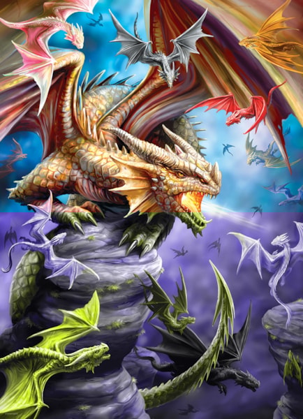 This epic 1000-piece Eurographics puzzle, "Dragon Clan" from the Anne Stokes Collection, transports you to a fantastical world teeming with mythical beasts. The powerful central dragon, with its magnificent wings and fiery breath, commands attention from atop a rugged peak. Surrounding it are a vibrant multitude of smaller dragons in various poses and colors, soaring through a dramatic blue sky.