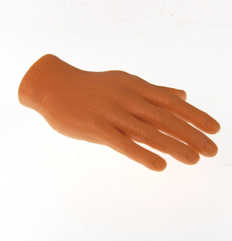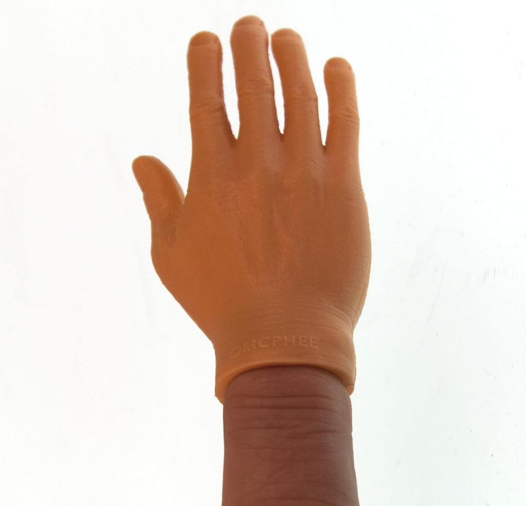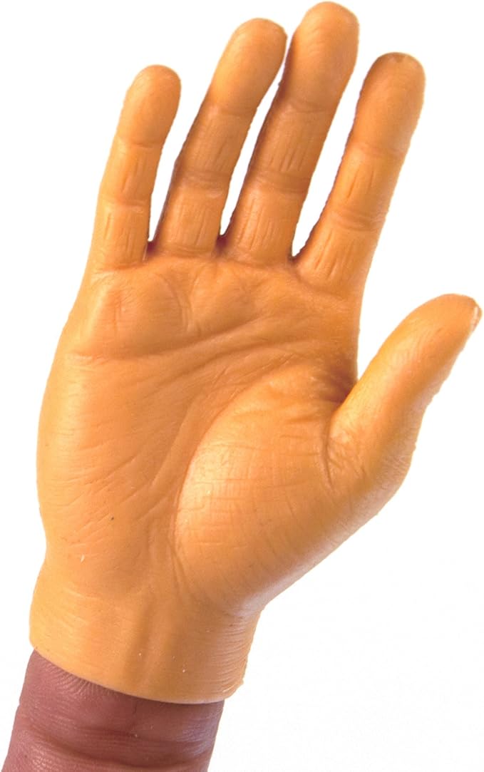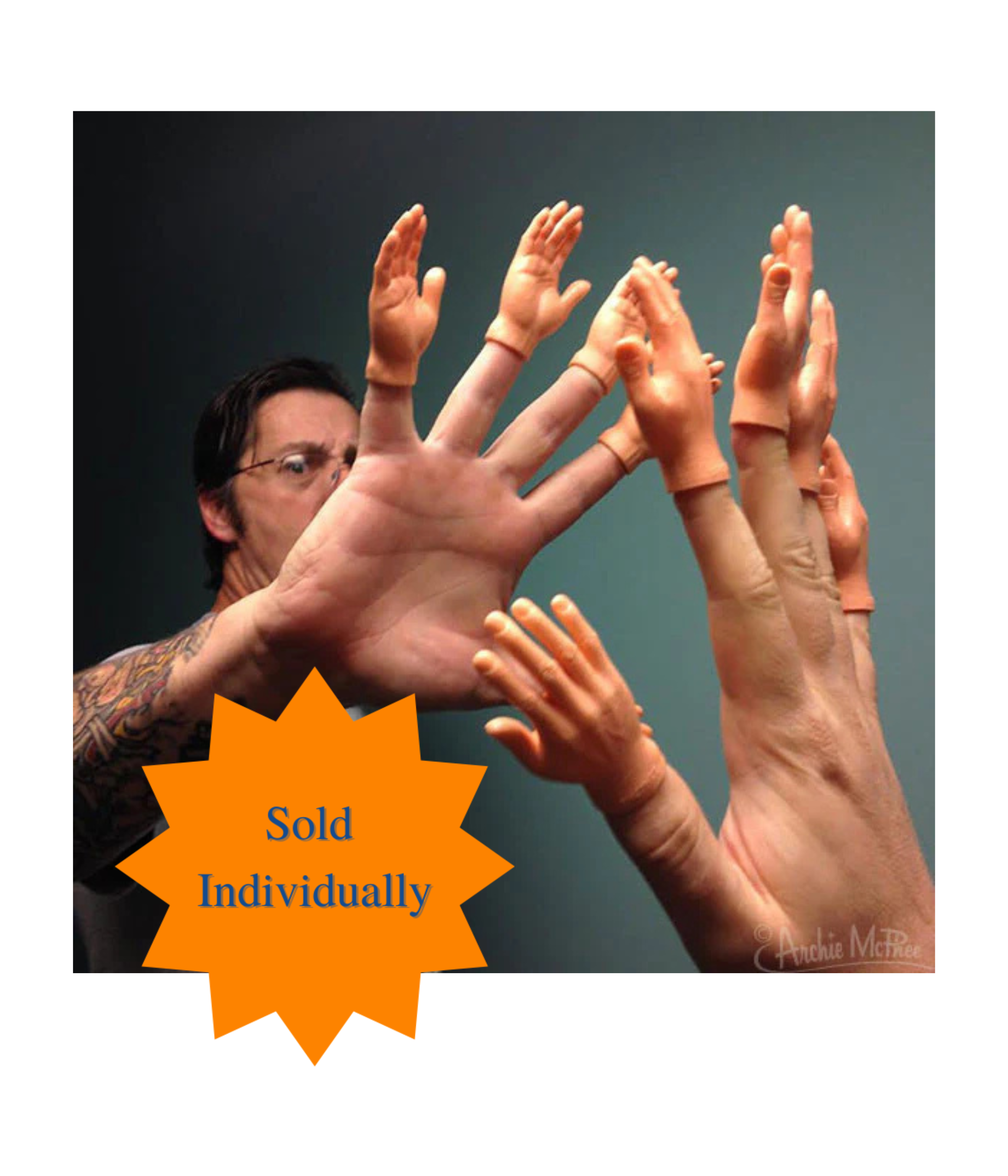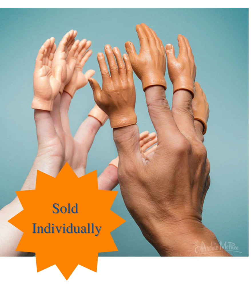 These soft vinyl finger puppets fit snugly on the end of your finger and look like a tiny right or left hand. Give someone a tiny high five. They are assorted lighter and darker hands