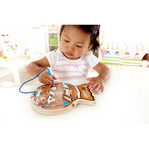 A magnetic wand worms marbles through this hand-held maze.