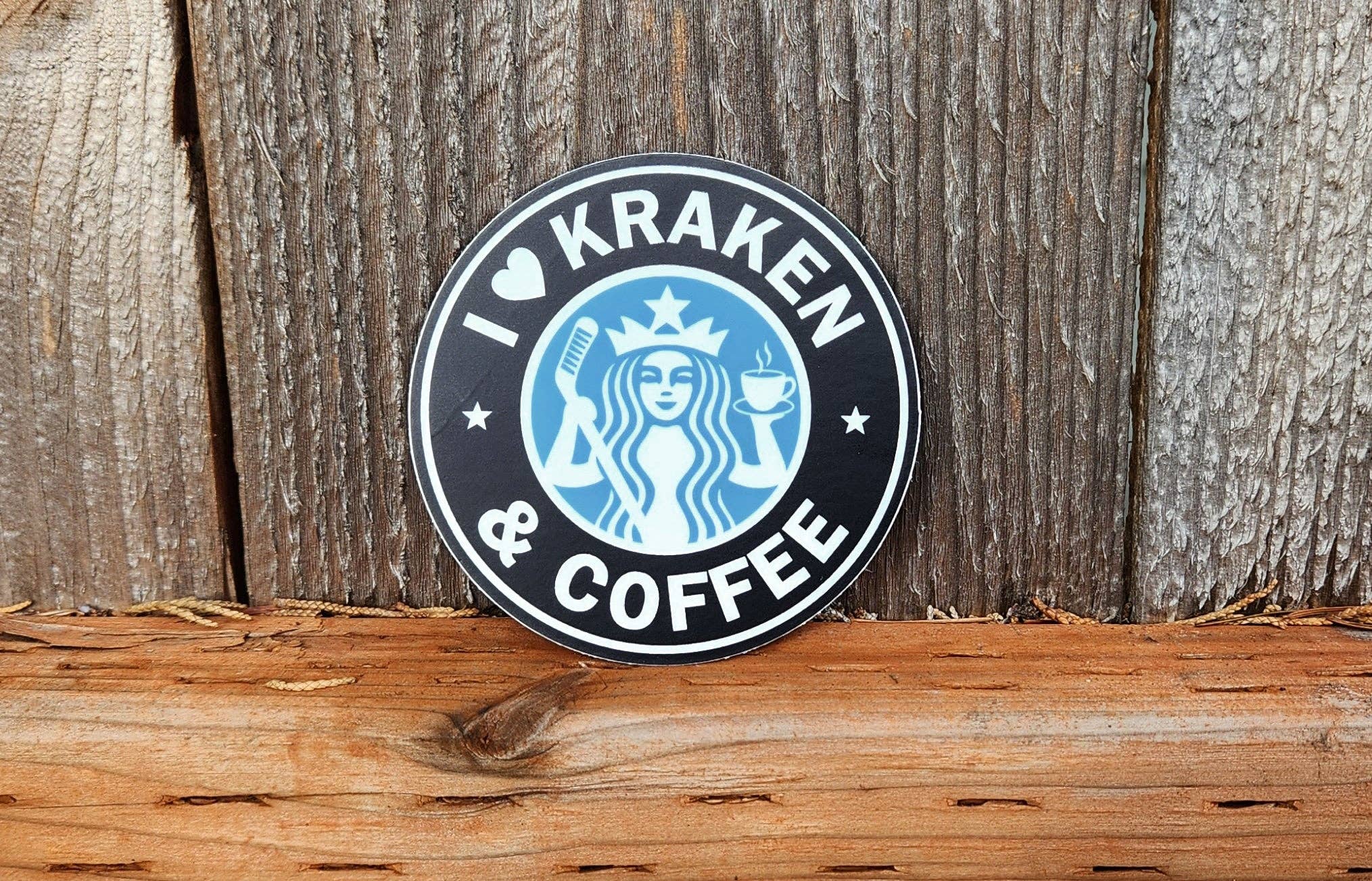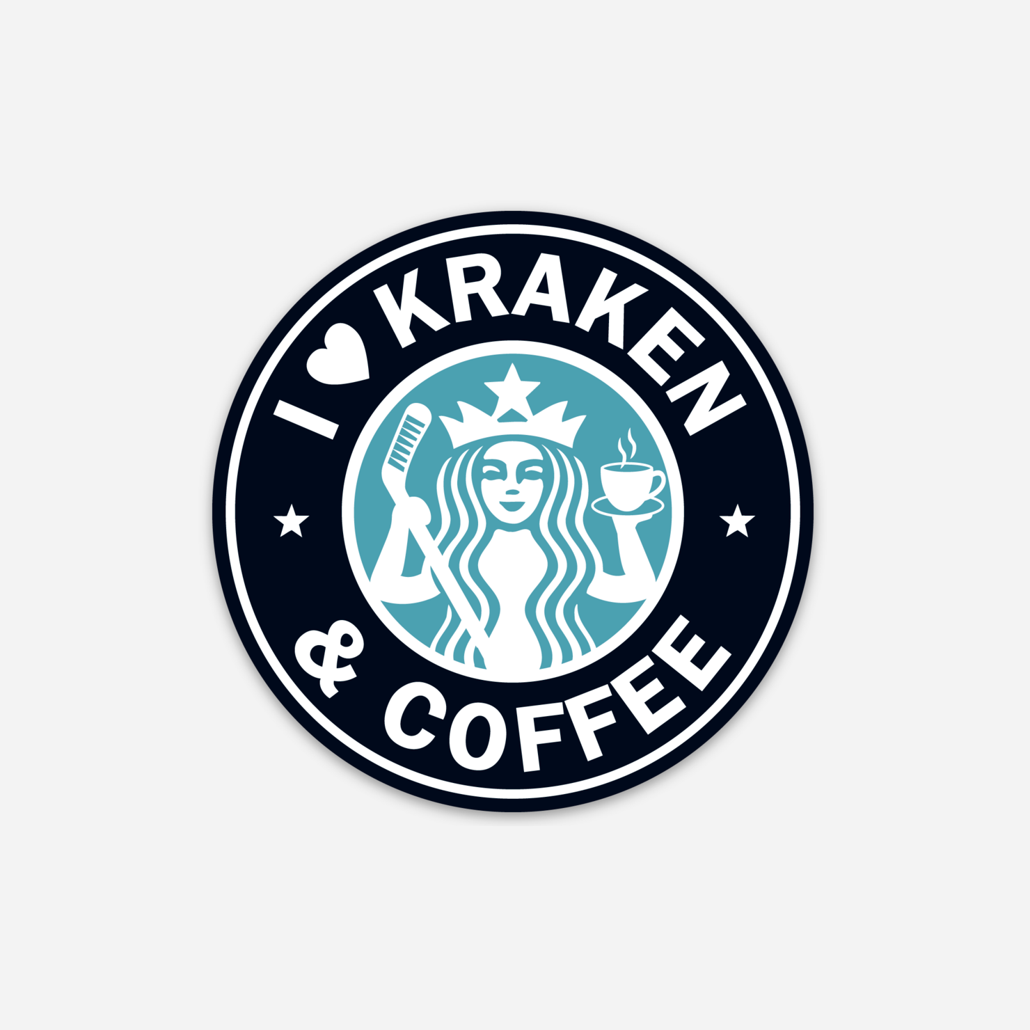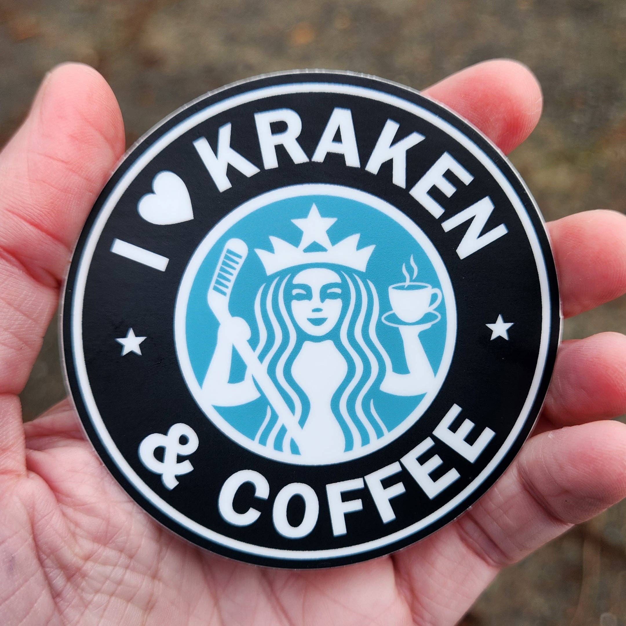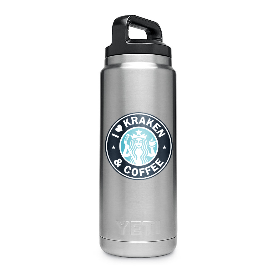 I Love Seattle Kraken & Coffee sticker, Hockey, Sports team, Starbucks. Size: 3" circle Packaging: Stickers are shipped without individual packaging, hang tags, or barcodes. Designs are grouped and packed in clear resealable cellophane bags for easy organization and restocking.