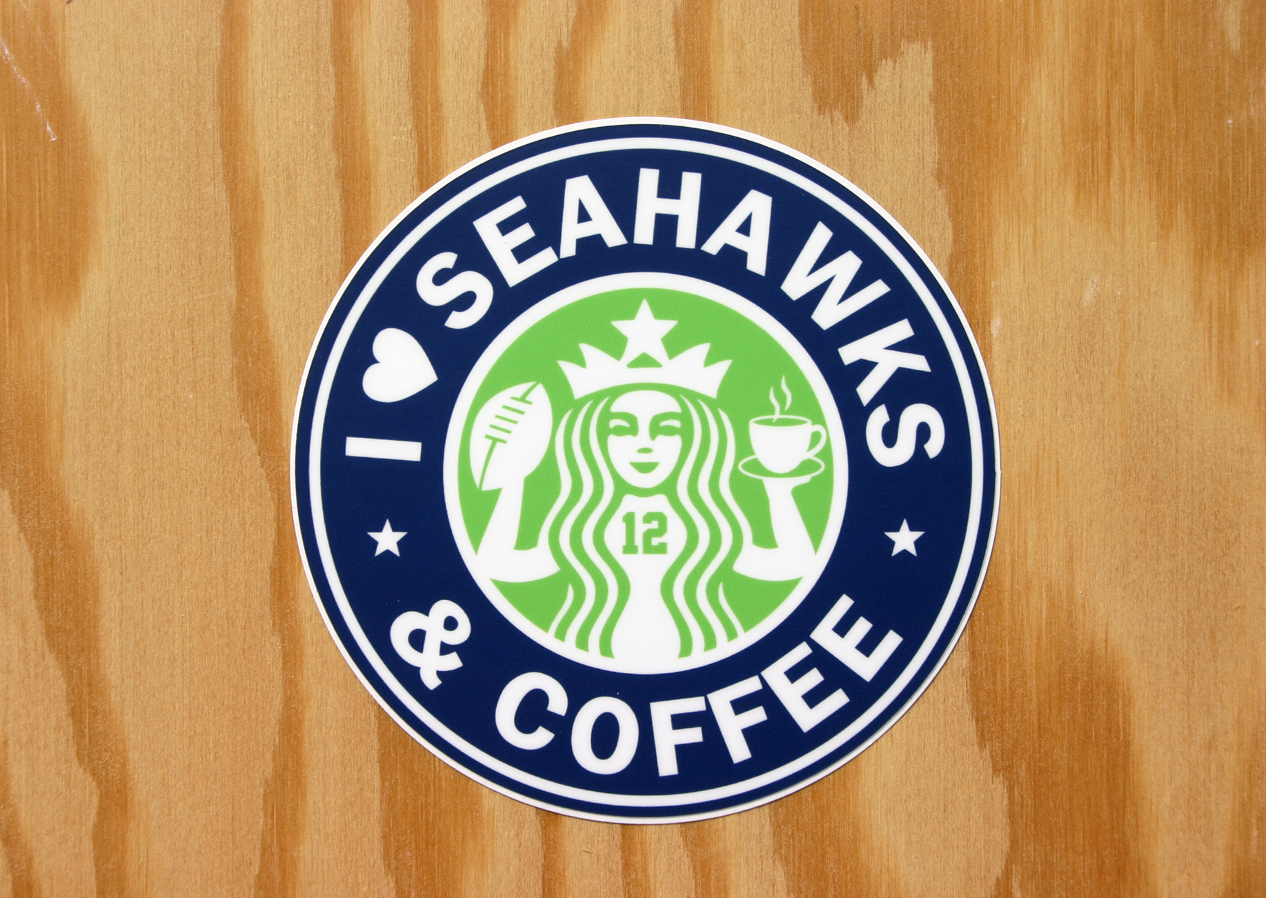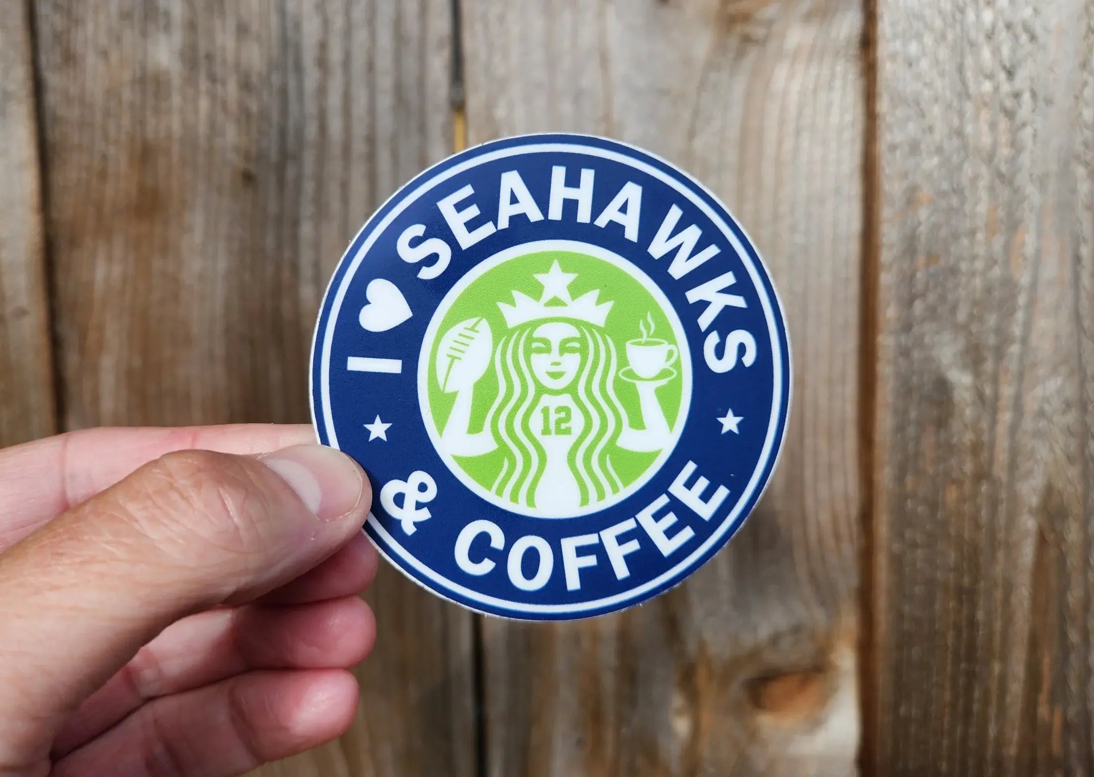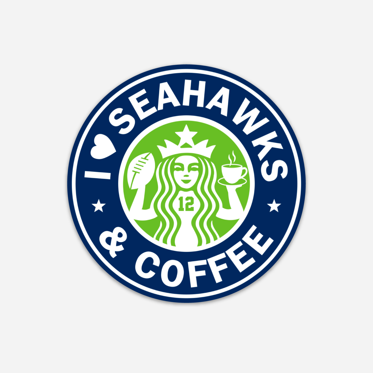 Seattle Seahawks & Coffee, Vinyl Sticker, Starbucks, Sports team, fans, Football. Size: 3" circle Packaging: Stickers are shipped without individual packaging, hang tags, or barcodes. Designs are grouped and packed in clear resealable cellophane bags for easy organization and restocking.