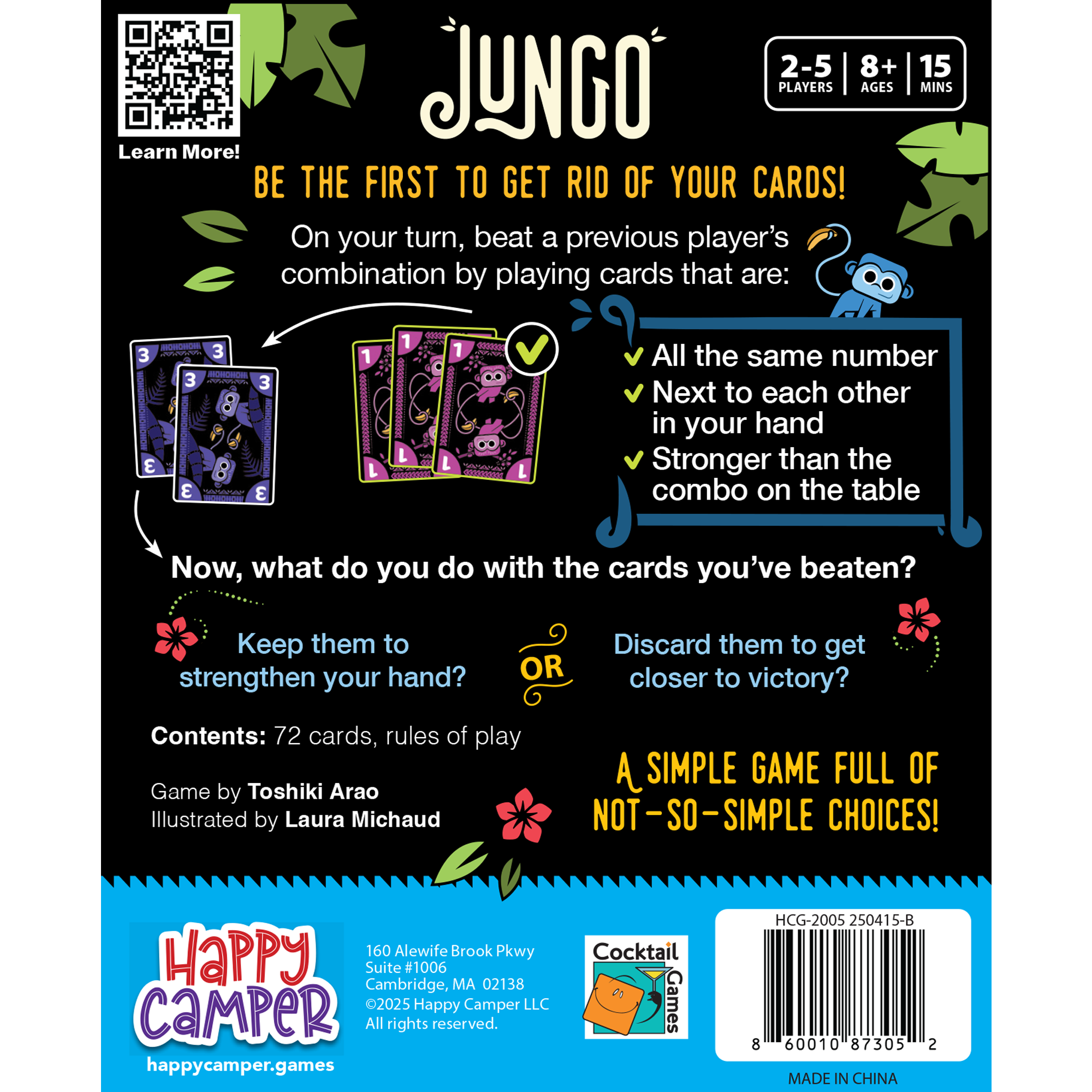 Be the first to get rid of your cards! On your turn, beat a previous player's combination by playing cards that are all the same number, AND adjacent in your hand, AND stronger than the cards in play. Then decide what to do with the cards you've beaten: keep them to strengthen your hand – or discard them to get closer to victory. A simple game full of not-so-simple choices!