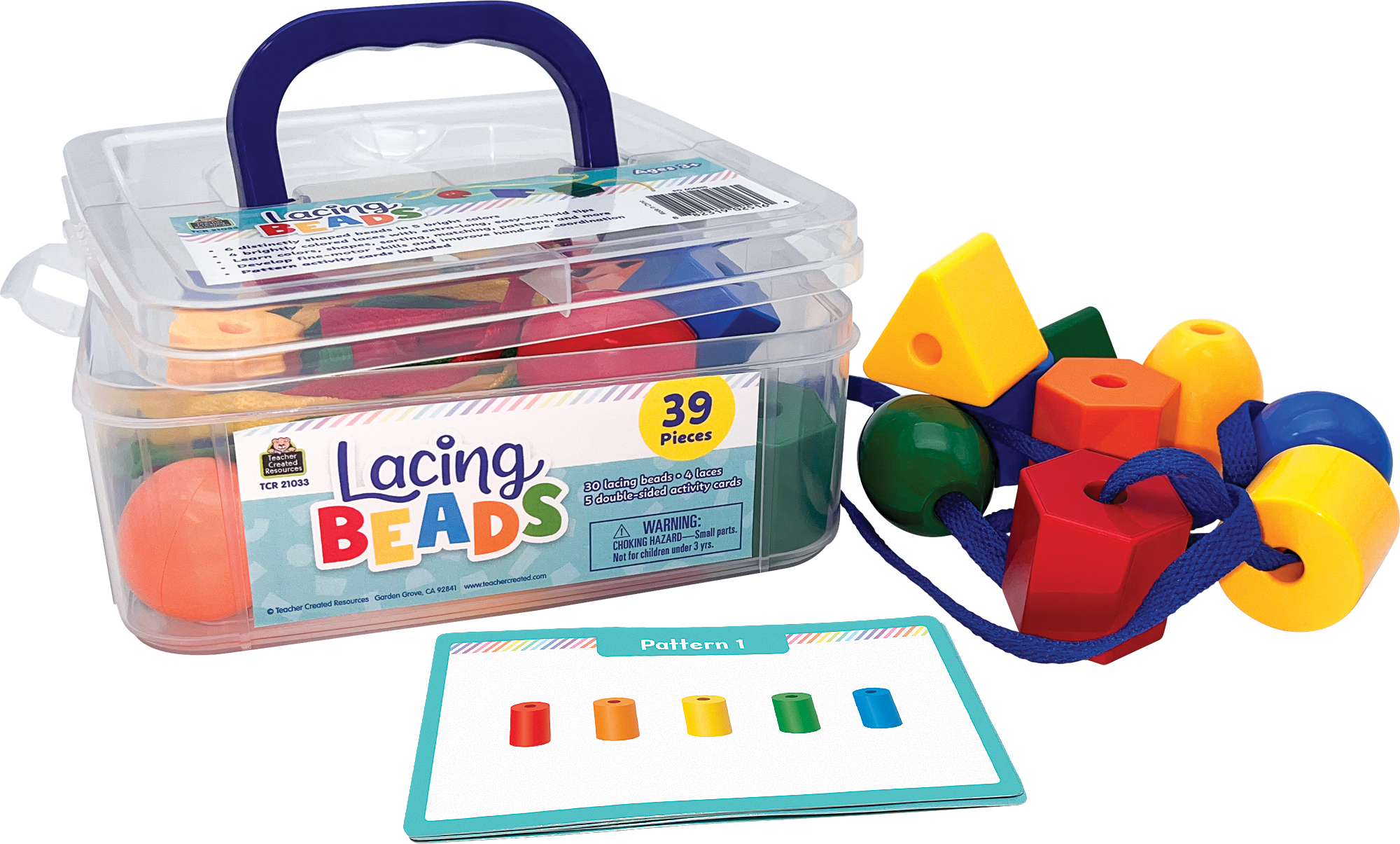 Learn colors, shapes, sorting, matching, patterns, and more with this lacing bead set. This collection of 30 lacing beads includes six distinctly shaped beads in five bright colors. Children will enjoy using one of the four brightly-colored laces to create different color and shape bead patterns. Extra-long lace tips make play easier for young learners. Also included are five double-sided activity cards that provide various color and shape patterns for children to replicate with their own laces and beads. The beads, laces, and cards all come in a stackable plastic case with a handle for easy transportation and storage.
