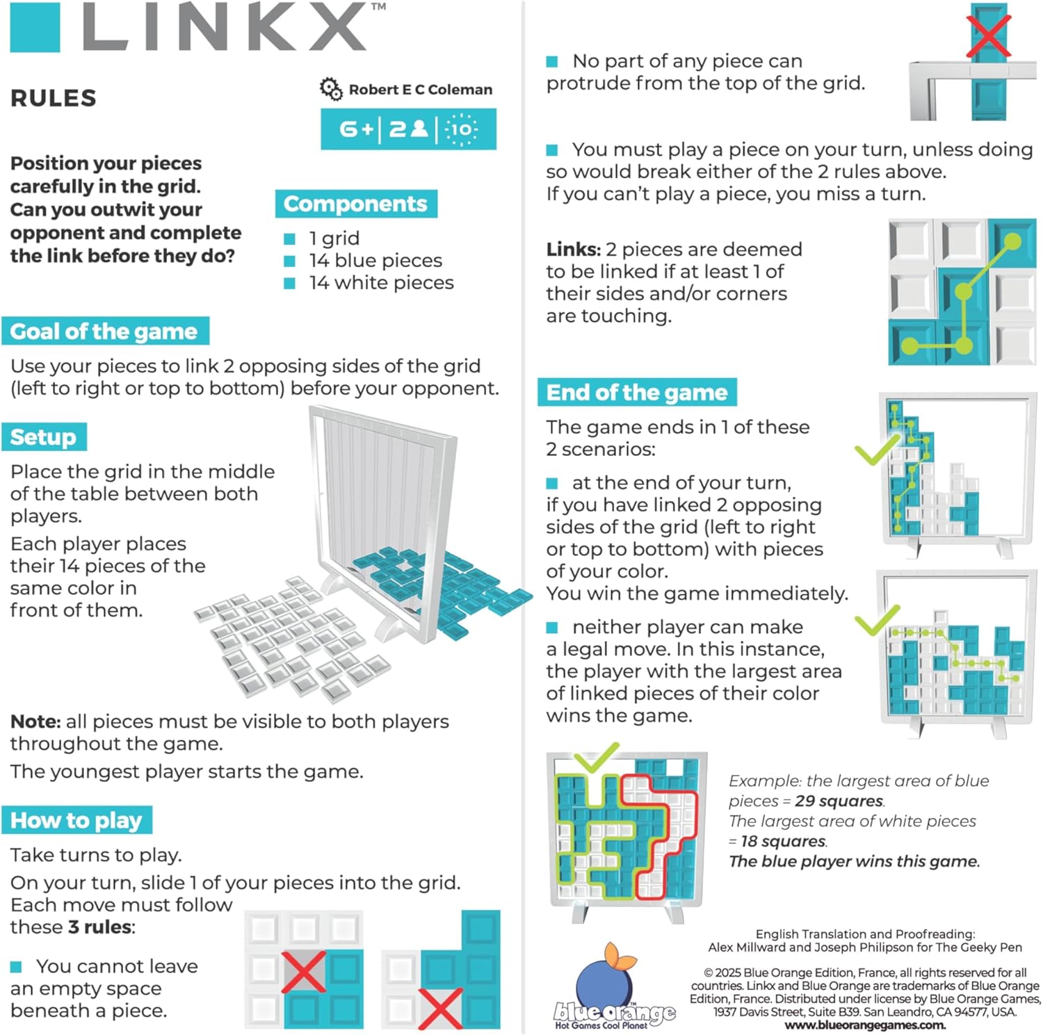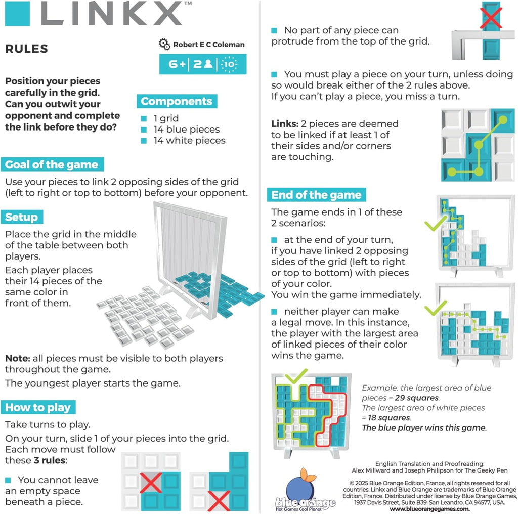 WHO WILL ENJOY PLAYING: Linkx can be enjoyed by children, teens, and adults. This super fun game helps develop critical thinking, turn taking, and fine motor skills. For 2 players only, ages 6 to 99.