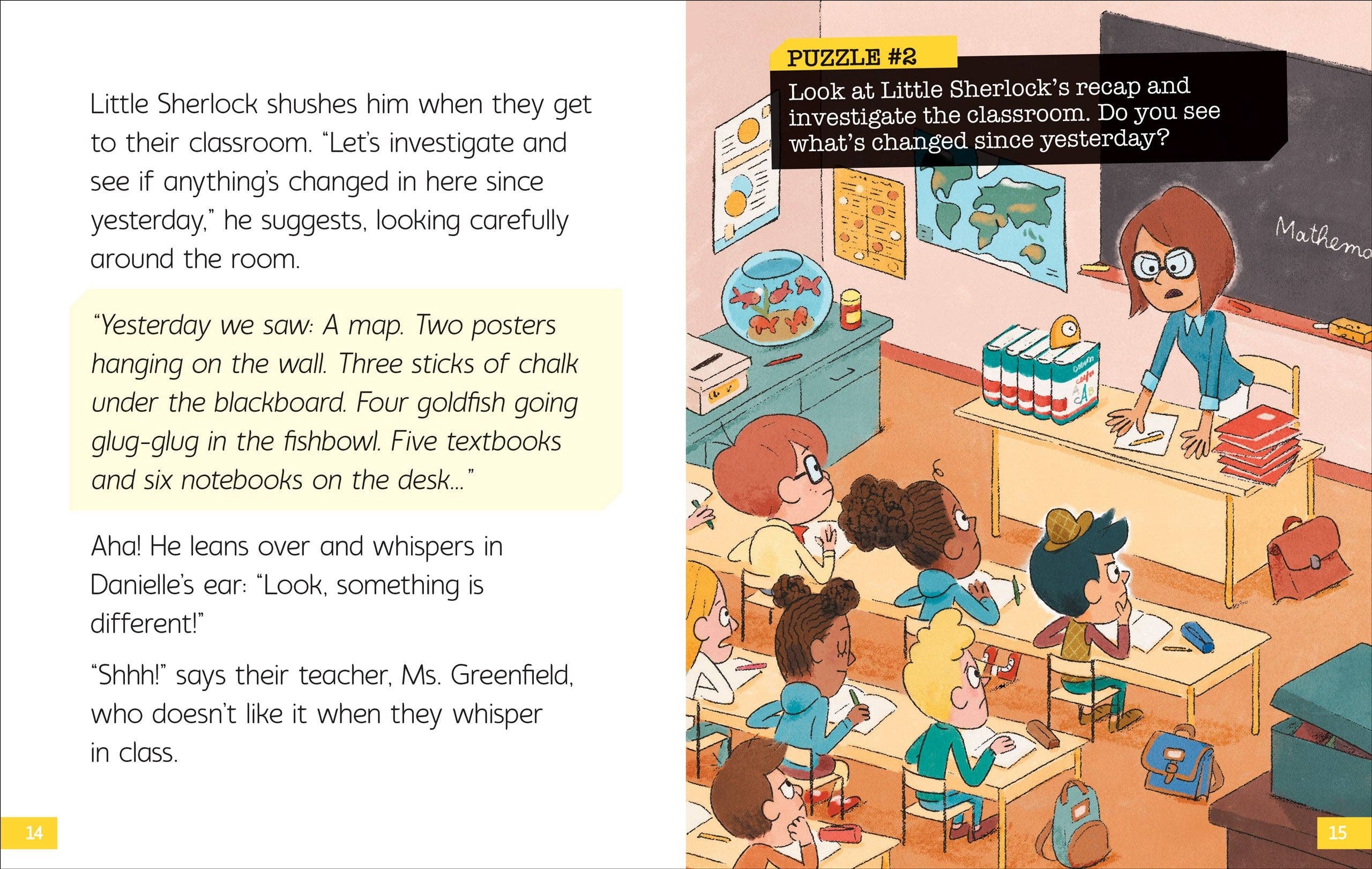 Solve puzzles with Little Sherlock! Little Sherlock and Doc Watson spot someone sneaking into school in the dead of night. There's something fishy going on in the classroom! Read & Solve to uncover the mystery! Easy-to-read story for ages 6 and up. Includes fun, engaging puzzles that encourage active reading. Young readers will practice language, logic, and reasoning skills as they solve the mystery. Sturdy hardcover binding. Read & Solve Storybook measures 6'' wide x 9'' high. 48 full-color pages.