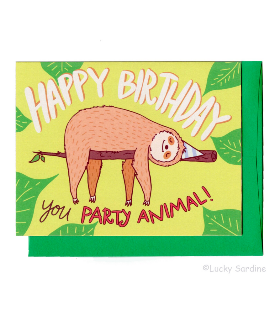 Celebrate in sloth style with our adorable "Sloth Party Animal" card by lucky sardine! This card is printed on high-quality recycled matte cardstock, ensuring a charming and eco-friendly touch. The card features a blank interior, providing ample space for your personalized message. Each card comes with a matching envelope of your choice, making it a complete and delightful package. Safely protected in a cello envelope, this sloth-themed card is perfect for sending birthday wishes, congratulations, or just a friendly greeting. Bring smiles and a laid-back vibe to any occasion with the "Sloth Party Animal" card – because who wouldn't want a sloth to join the celebration?