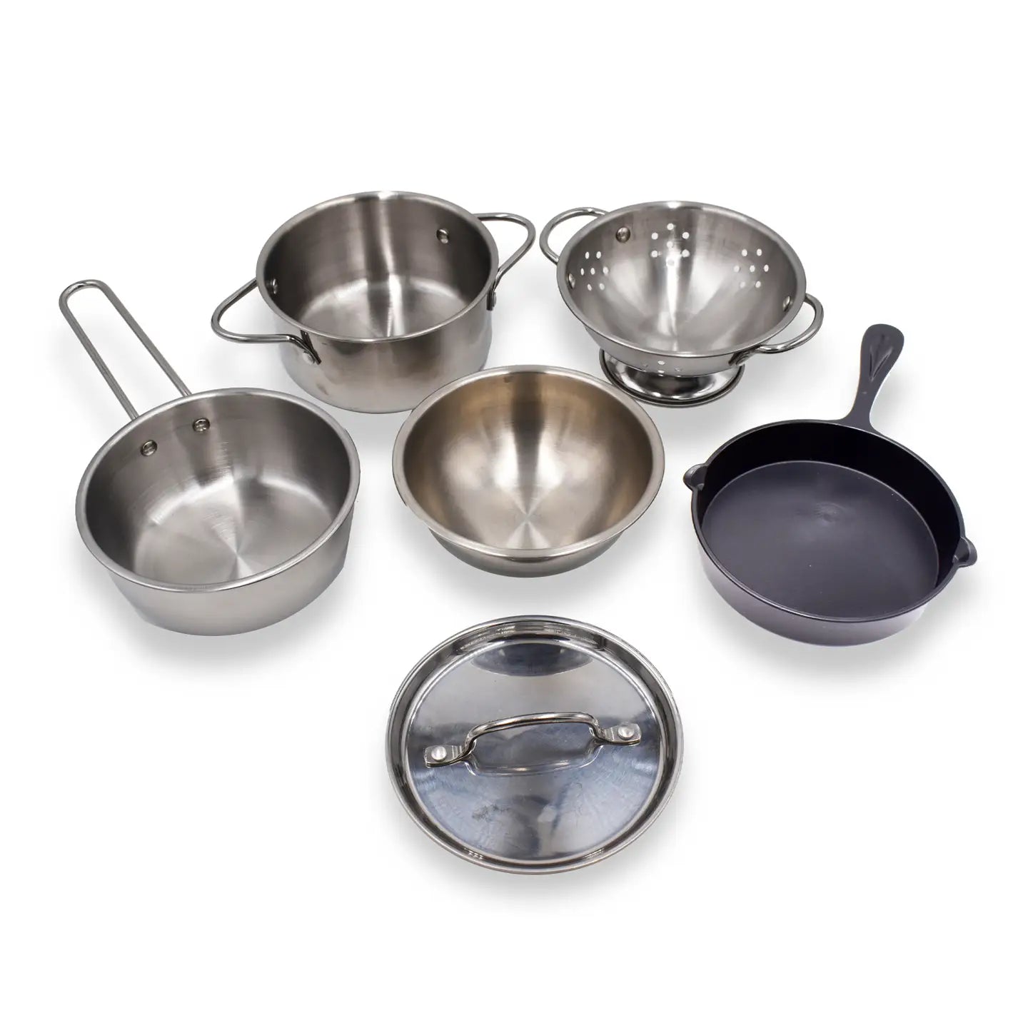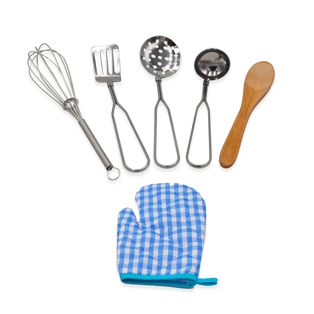 - Our 12-piece playset includes: Whisk, Spatula, Strainer Spoon, Ladle, Wooden Spoon, Cooking Pot, Lid, Sauce Pan, Skillet, Bowl, Colander, and an Oven Mitt.