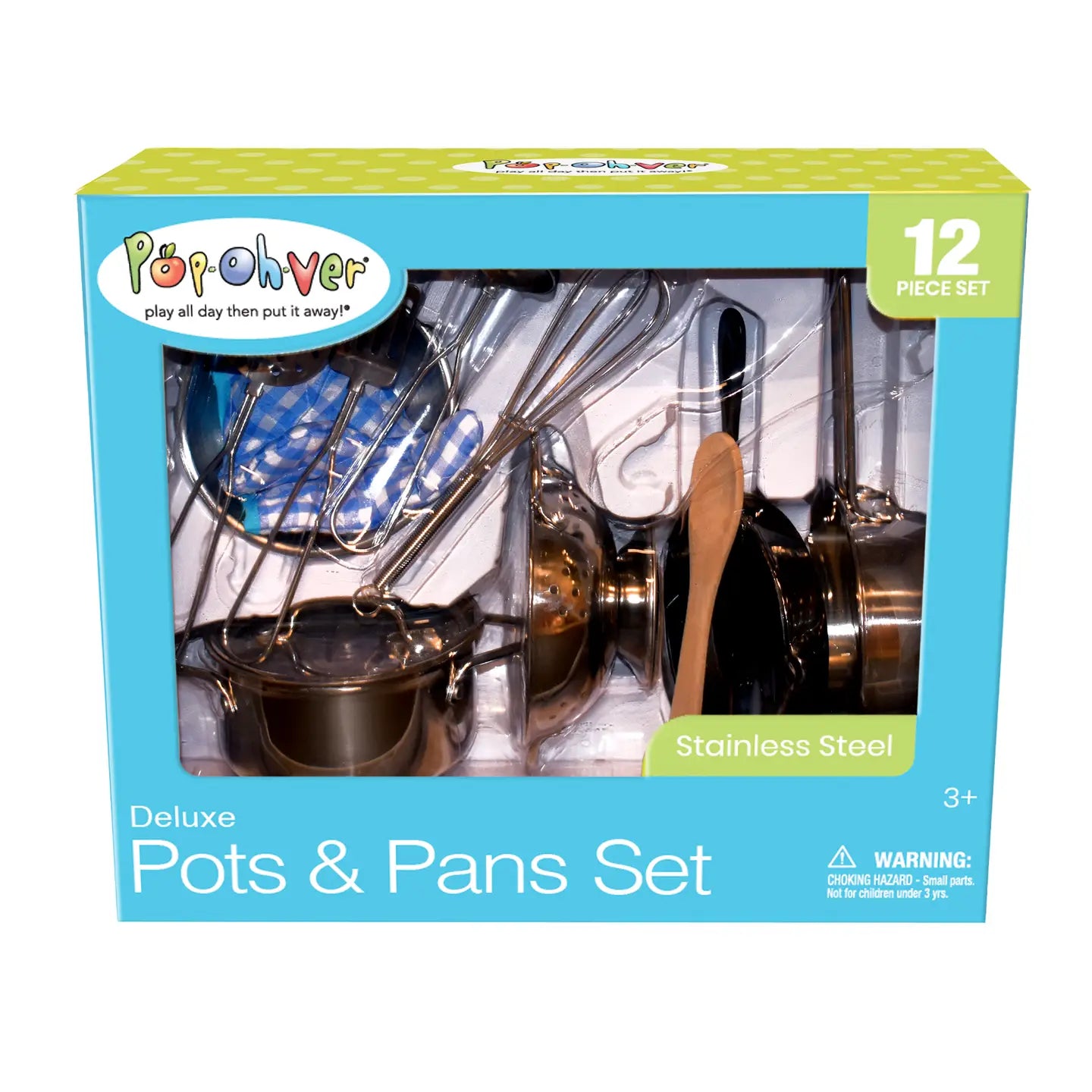 No PopOhVer kitchen is complete without our PopOhVer Deluxe Pots & Pans Set! Made of sturdy, stainless steel with a polished mirror finish, our pots and pans look like real kitchenware!