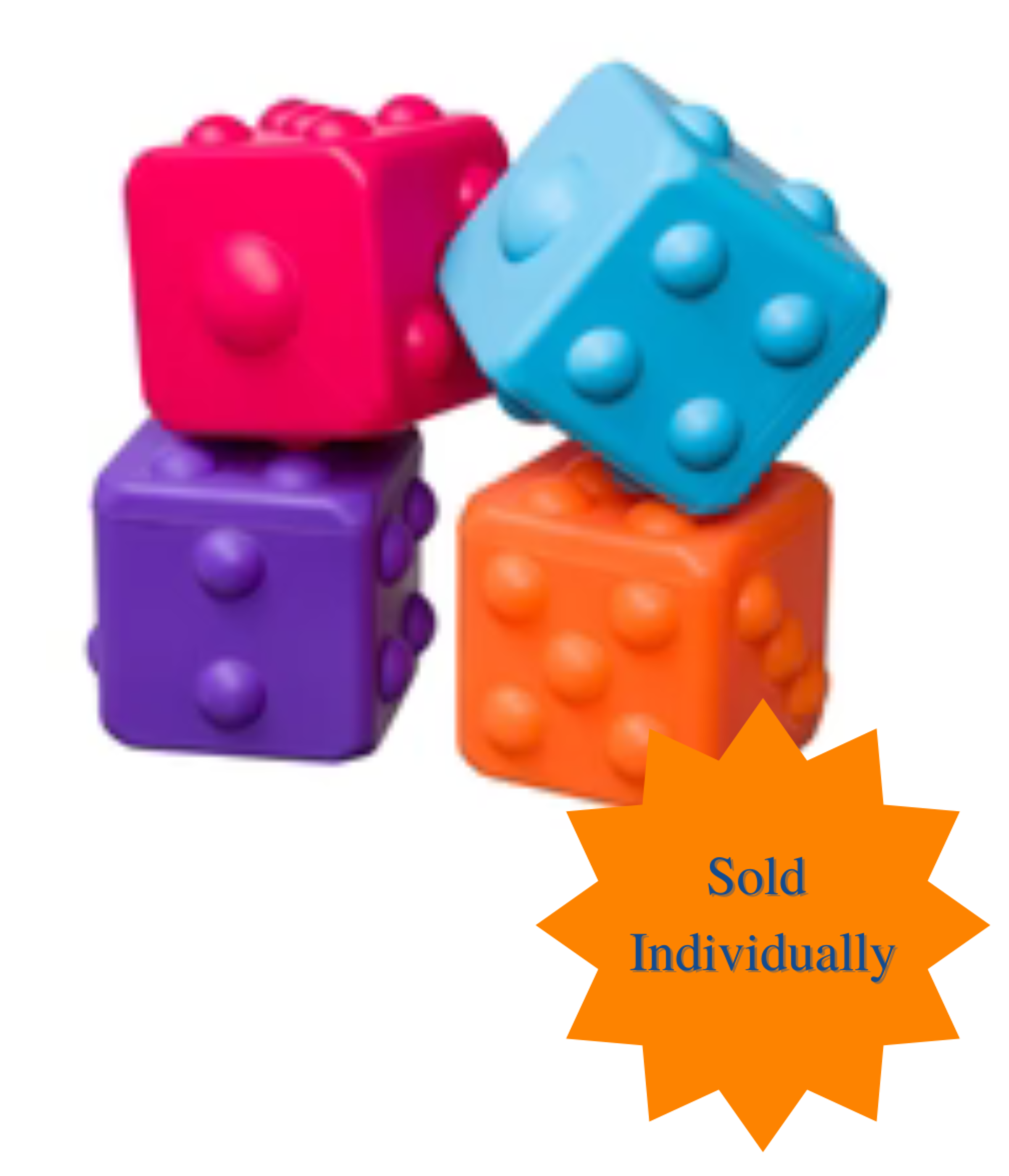 Fun to squeeze, bounce, roll, and pop, these squishy cubes have nubbins on each face, arranged just like the dots on regular dice. Available in one of four bright, friendly colors, these dice provide a satisfying, rubbery sensory experience, making them the perfect fidget toy. Relieve stress, promote focus, and work on math skills like counting and simple arithmetic.